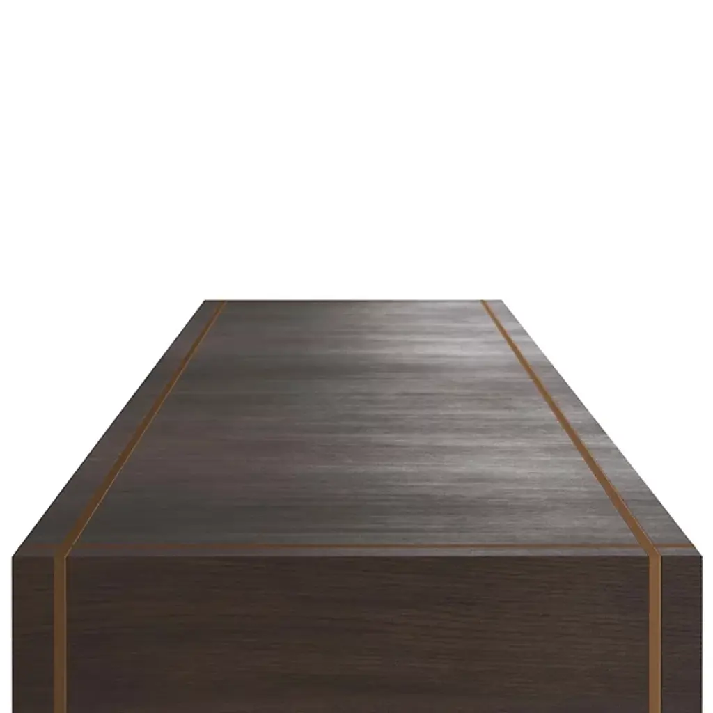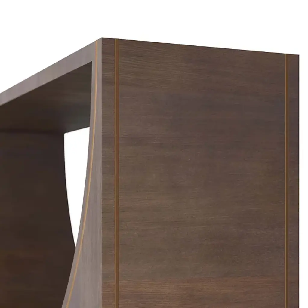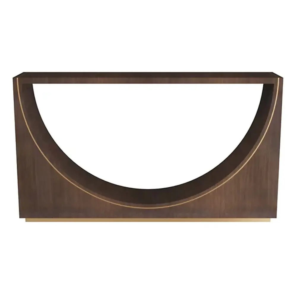 The Tatton Console from Arteriors is a beautiful piece of furniture that plays with positive and negative space. The console features an inverted arched umber oak veneer base that adds a sense of depth and dimension, accented with an antique brass inlay that follows the curve of the pedestal and returns across the top of the console. The console rests atop an antique brass plinth that adds stability and further emphasizes the elegance of the design.