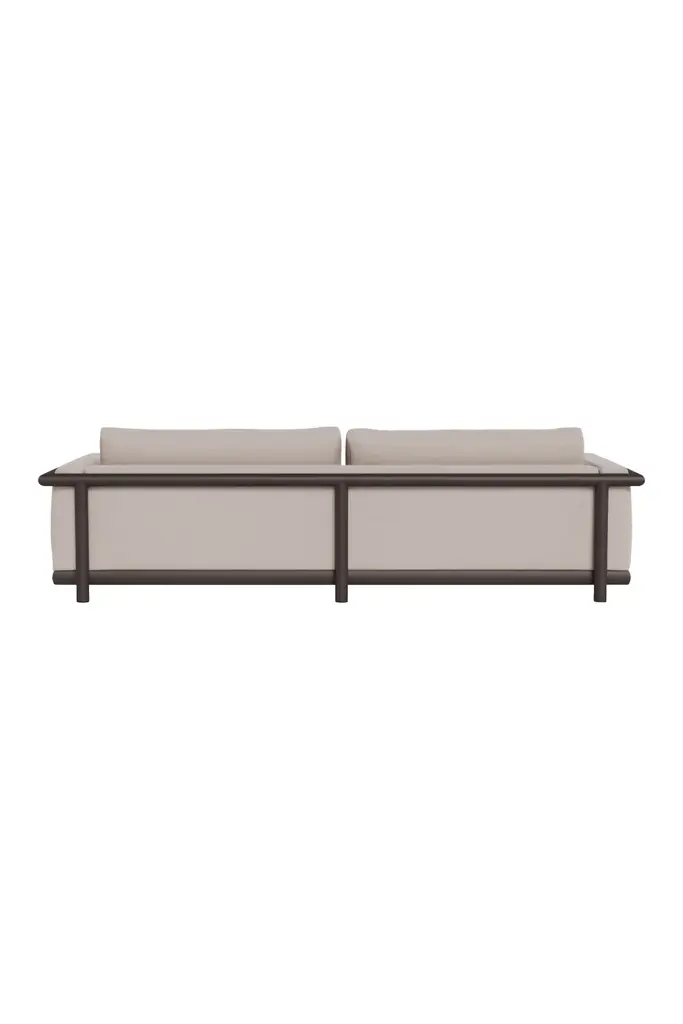Cayman boasts a generous bench cushion at medium height on a light bronze-colored, powder-coated, rust-proof extruded aluminum frame with side wall cushions for added comfort. Upholstered in taupe-colored, removable, cleanable, anti-mold, and waterproof fabric with outdoor foam fillings meaning it is suitable to be left outdoors. The tubular construction and a thin streamlined profile introduce a dynamic element to this classic look. This striking piece brings a contemporary aesthetic to any outdoor space.