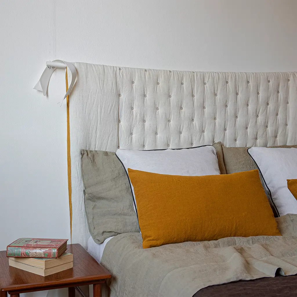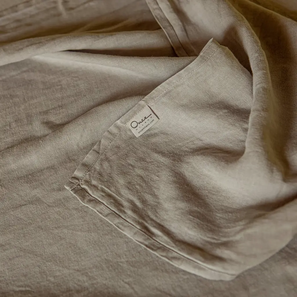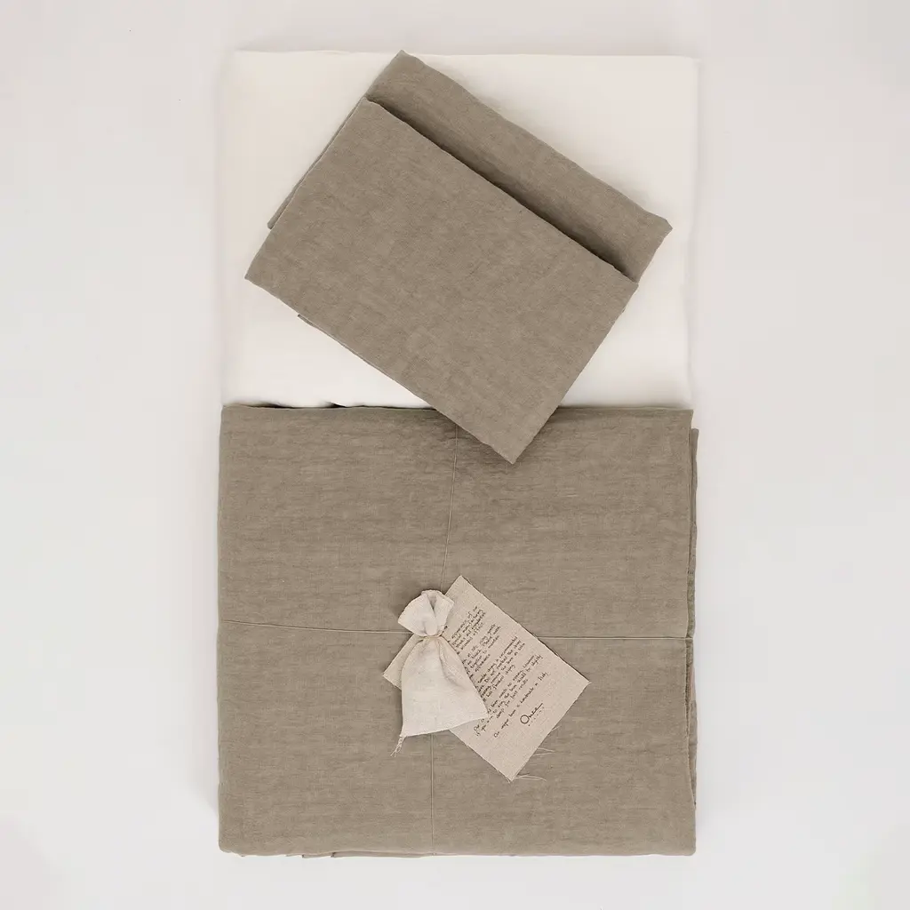 Discover elegance with this taupe summer bed set, handmade from the finest linen. The set includes a top sheet and matching pillowcases in a sophisticated taupe shade, complemented by a white fitted sheet for mattresses up to 30 cm deep. The delicate hue is perfect for neutral-colored rooms, while the lightweight linen (165 gr/sqm) ensures a comfortable, crisp touch for a luxurious experience. Available in various sizes, please ask the concierge for other details.