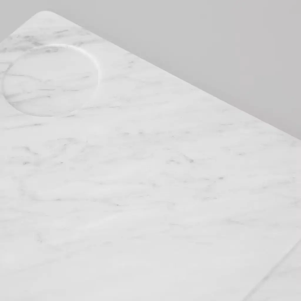 A luxe and cutting-edge take on classic placemats, this design is fashioned of prized white Carrara marble to make it everlasting and endlessly sophisticated. Subtly recessed areas are designed to neatly display cutlery and glasses, bringing contemporary style to its pinnacle in both aesthetic and functionality terms. Marked by rounded corners, this precious place board is a singular piece due to the inherent singularity of the marble's hue, veins, and inclusions. Please note that marbles and stones are natural materials and they can differ also if coming from the same quarry or the same block. The product shown may differ from purchased items. Every piece is unique.