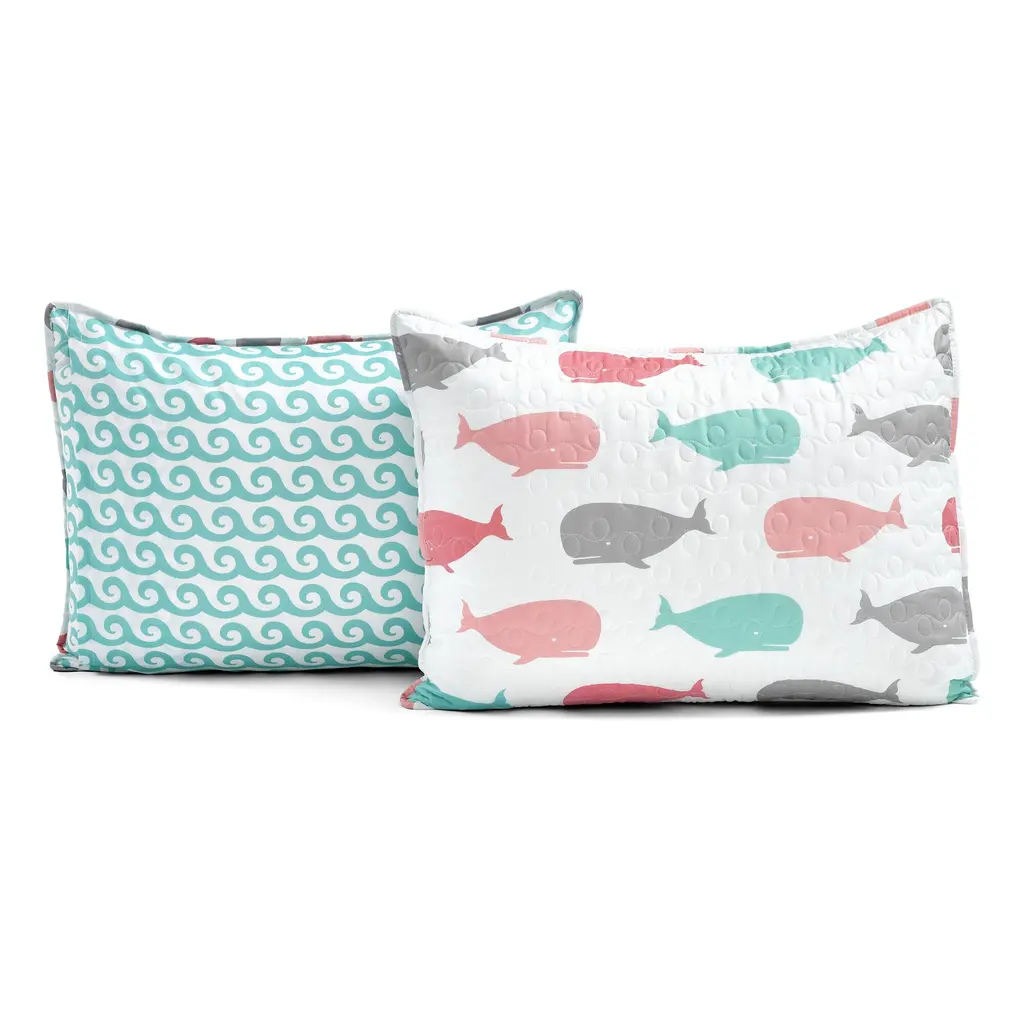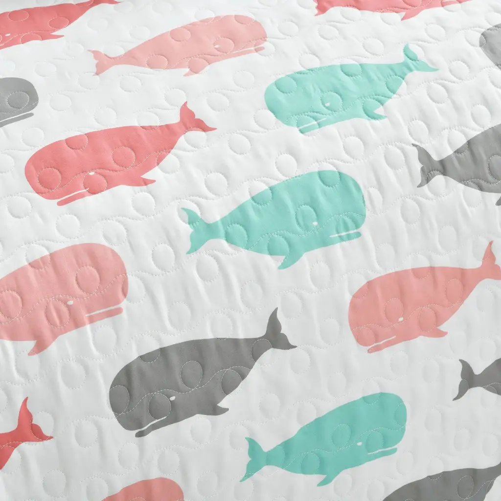 Create a charming nautical-themed bedroom with this soft microfiber quilt set from Taylor & Olive. The cozy quilt and shams feature a whale print that reverses to a coastal wave pattern to suit your mood. Choose from pink or blue and complete the look with the included decorative pillows.Features:Made of 100-percent microfiberNautical, coastal styleBlue and white or pink and grey colorWhale patternReverses to wave patternReversible designMachine washableSet includes quilt, 2 decorative pillows, and 2 shams (1 in twin)Twin Dimensions:Quilt: 68 inches wide x 86 inches longSham: 20 inches wide x 26 inches longPillow 1: 11 inches wide x 21 inches longPillow 2: 16 inches wide x 16 inches longFull/Queen Dimensions:Quilt: 92 inches wide x 88 inches longShams: 20 inches wide x 26 inches longPillow 1: 11 inches wide x 21 inches longPillow 2: 16 inches wide x 16 inches long