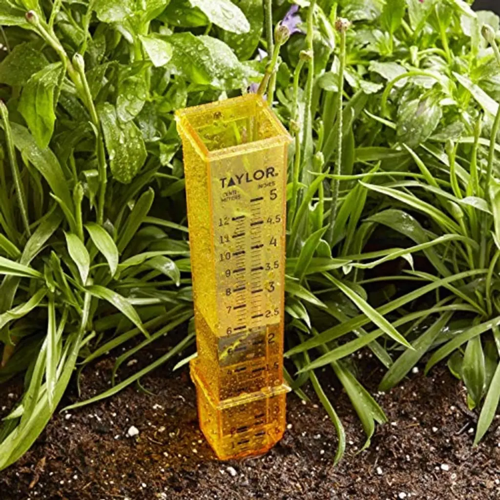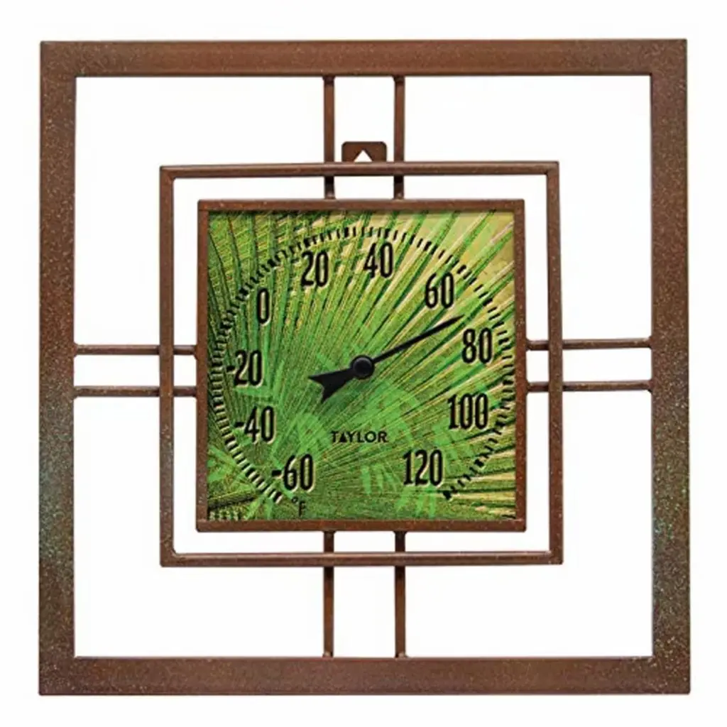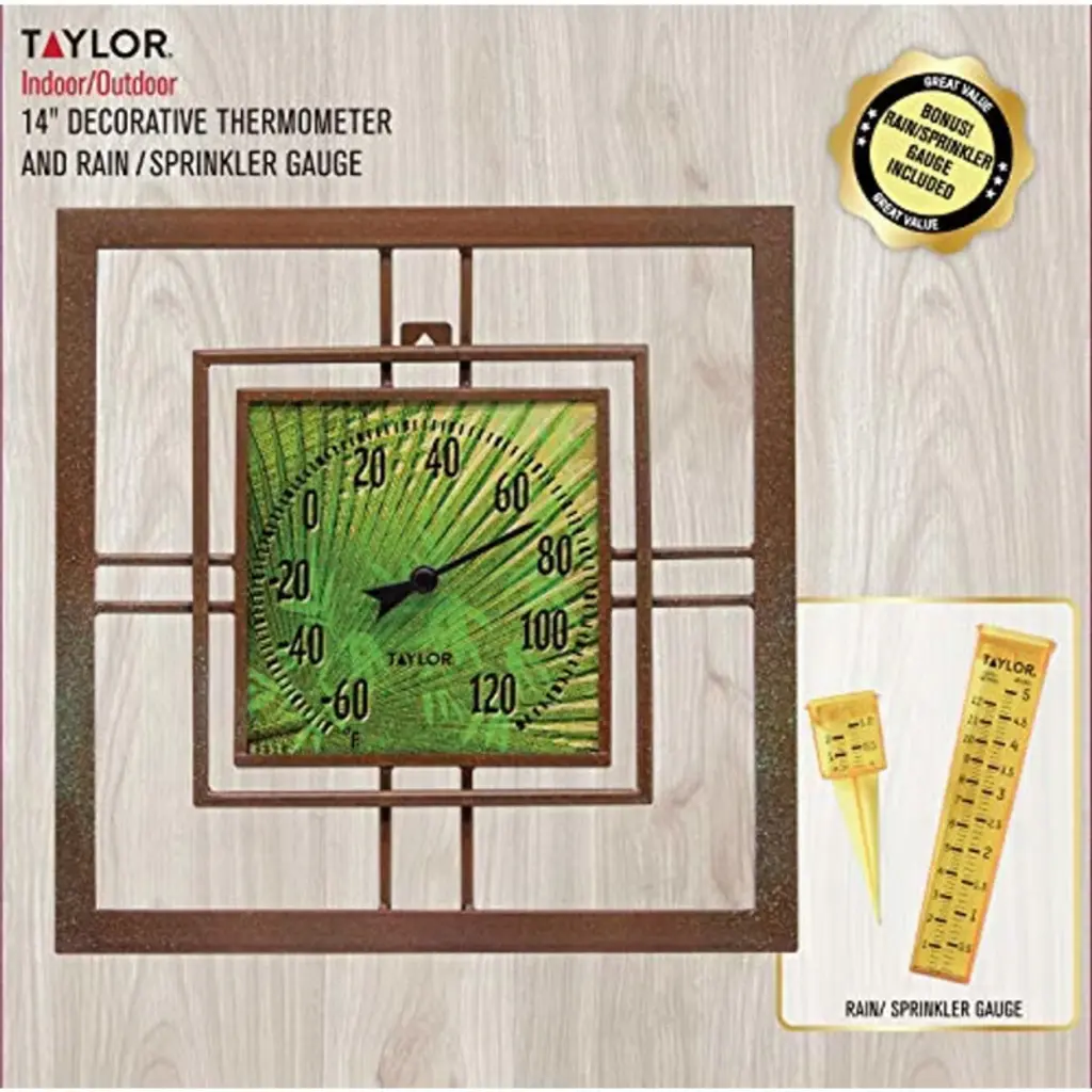 Enhance your outdoor space with the Taylor Metal and Glass Bamboo Leaf Outdoor Thermometer and Rain/Sprinkler Gauge. This functional 2-in-1 tool is designed to monitor both temperature and rainfall, making it an essential addition to any garden, patio, or greenhouse. The outdoor thermometer measures a broad temperature range from -60°F to 120°F, allowing you to stay informed about the weather in every season, whether during icy winters or hot summer days. The hand-painted bamboo leaf design adds a stylish element to this practical tool, and its UV and fade-resistant coating ensures the design remains vibrant even after prolonged exposure to sunlight. Along with the thermometer, the rain gauge measures up to 5 inches of rainfall, making it simple to monitor water levels for gardening, landscaping, or weather awareness. The bright yellow background and bold black increments ensure easy readability from a distance. This dual-purpose set combines functionality and visual appeal, providing useful weather information while complementing your outdoor decor. Whether you're tracking temperatures or ensuring proper irrigation, the Taylor outdoor thermometer and rain gauge set is a valuable tool for any outdoor enthusiast.