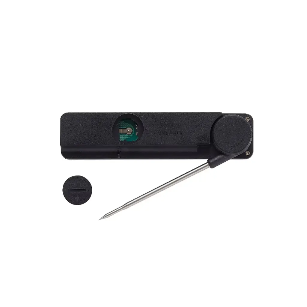 This thermometer is compact in size, folds away for convenient storage, and has a built in carrying hole. The small size is perfect to take along for grilling, tailgating, or vacations. The thermometer has a wide temperature range of -40° F to 392° F (-40° C to 200° C) that can be read on the large 0.7” LCD readout. The thermometer comes with an ON/OFF button on the back of the unit along side the C/F switch. The thermometer runs on one LR44 battery (included).Helpful hints: Digital thermometers are not meant to be left in food during cooking. The plastic and electronic components could be damaged with excessive heat.WARNING: INGESTION HAZARD: This product contains button cell or coin battery