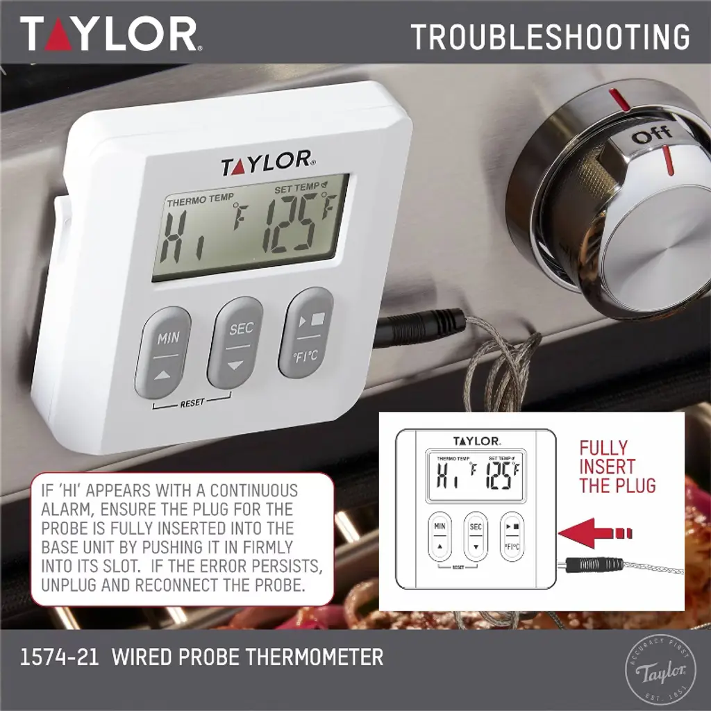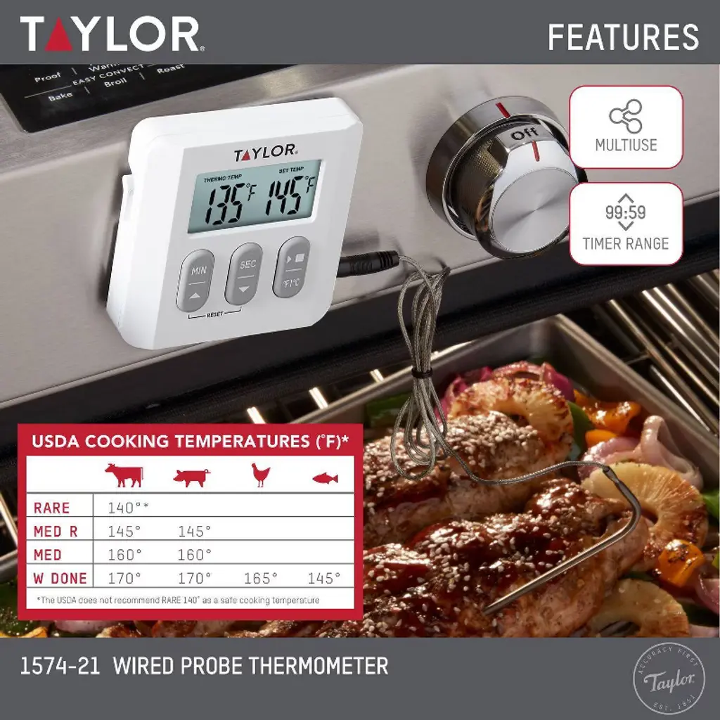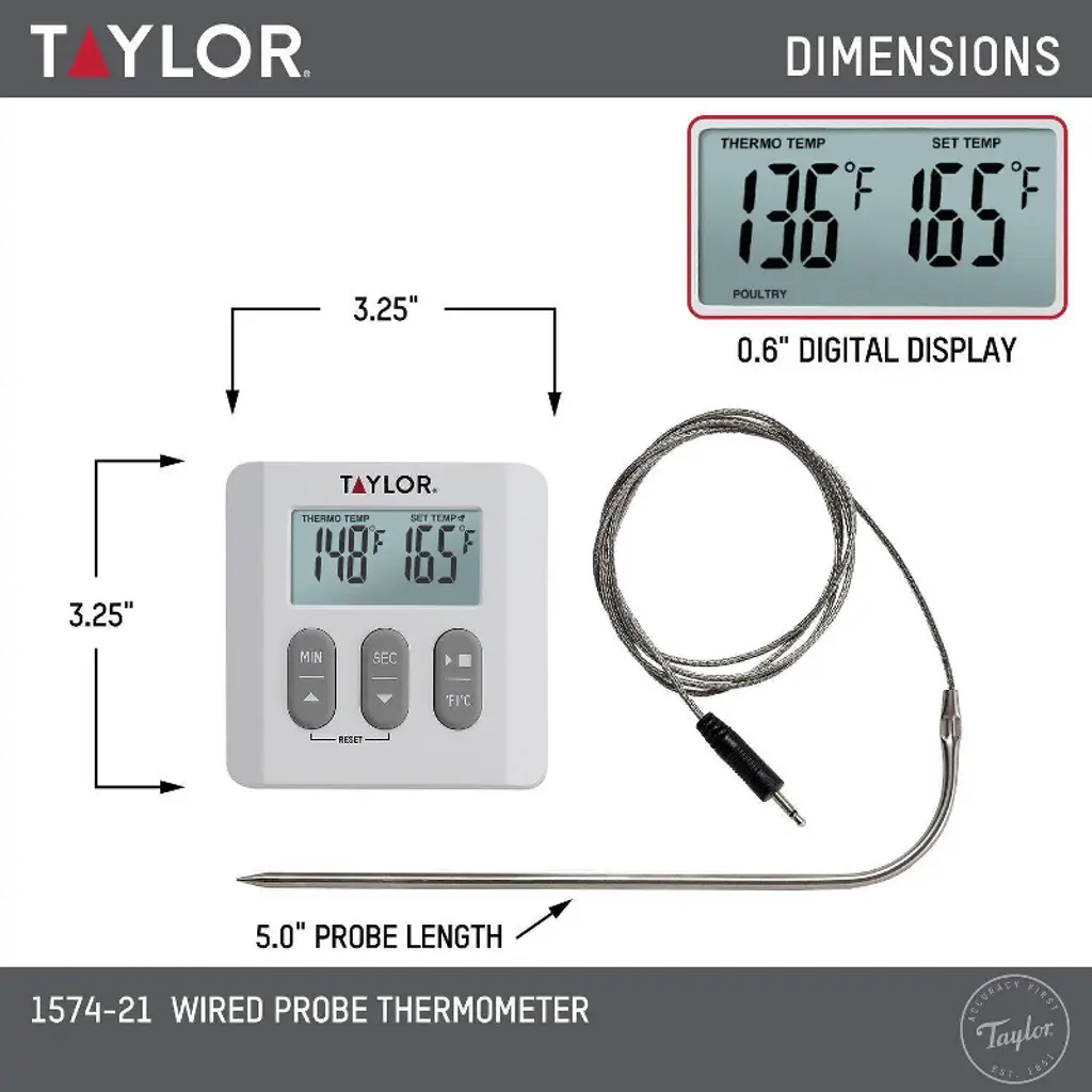While instant read thermometers are fantastic tools, wouldn't it be easier if you never had to slow down the cooking process by constantly opening your oven door to check the temperature? The Taylor 1574-21 probe thermometer is a great looking solution to this age old problem. Its 6"probe is attached to a 39"braided cord that threads into your oven without a need for the door to be open, allowing the stylish base unit to be stationed on your countertop from where it can conveniently display exact internal temperature readings. Product Information: The thermometer's programming allows you to set your desired internal temperature; when this temperature is reached, the base unit will automatically sound to alert you. Its 99 minute, 59 second timer features a multi-tone alert, making it easy to differentiate between meat doneness and timer alerts. For maximum readability, the base unit can stand independently or be stuck to a magnetized surface. What's In The Box?Inside the box, you will find the Taylor 1574-21 thermometer and 1 AAA battery. This thermometer is backed by a 1 year limited warranty.