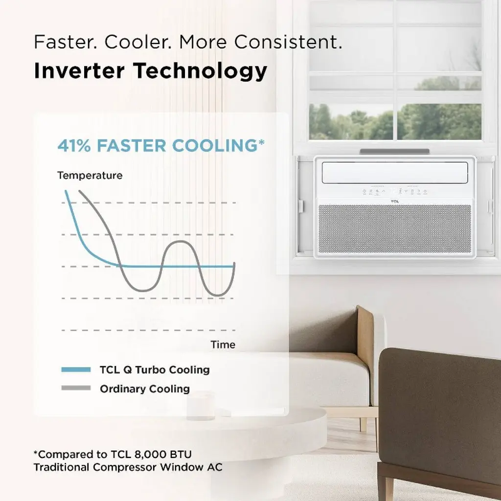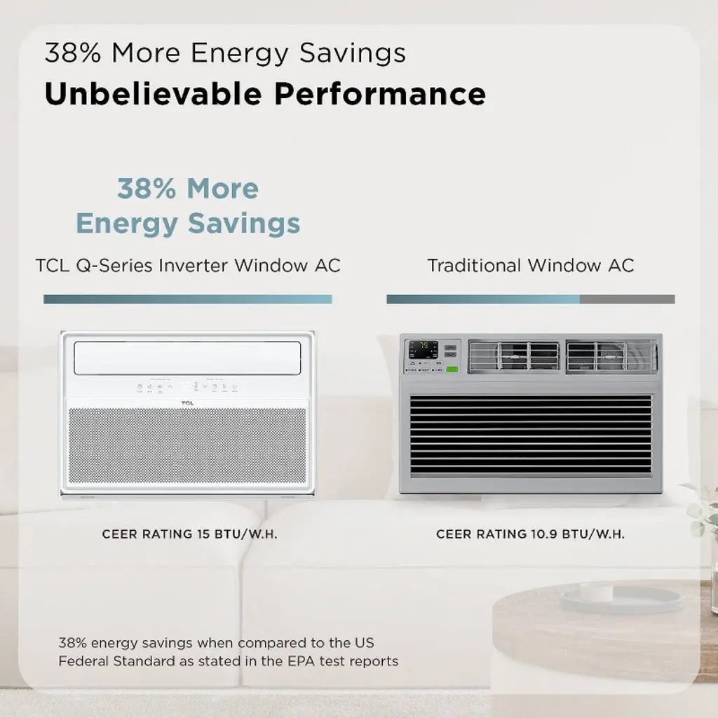 Experience powerful, ultra-quiet cooling with the TCL Q-Series Inverter Window AC. Perfect for spaces up to 350 sq. ft., this inverter ac unit delivers quick, consistent cooling while operating as quietly as 32dB in Fan mode and 40dB in Cooling mode. Save up to 38% on energy with AI Inverter technology and ENERGY STAR certification. Installation is simple with a pre-assembled frame that fits windows 24-36” wide. Enjoy full control through the TCL Home App, voice assistants, or your TV. Plus, its secure design lets you open and close your window freely. Stay cool with smarter, quieter, and more efficient performance. Actual coverage may vary based on room size and configuration (ceiling height, number of windows, and other varying conditions) and environment factors such as number of occupants, home insulation, etc. 38% energy savings when compared to the US Federal Standard as stated in the EPA test reports. Performance claims are based on internal laboratory testing conducted in accordance with ISO3744 standards. The actual performance and results of this product may vary based on individual usage, environmental factors, and other variables.