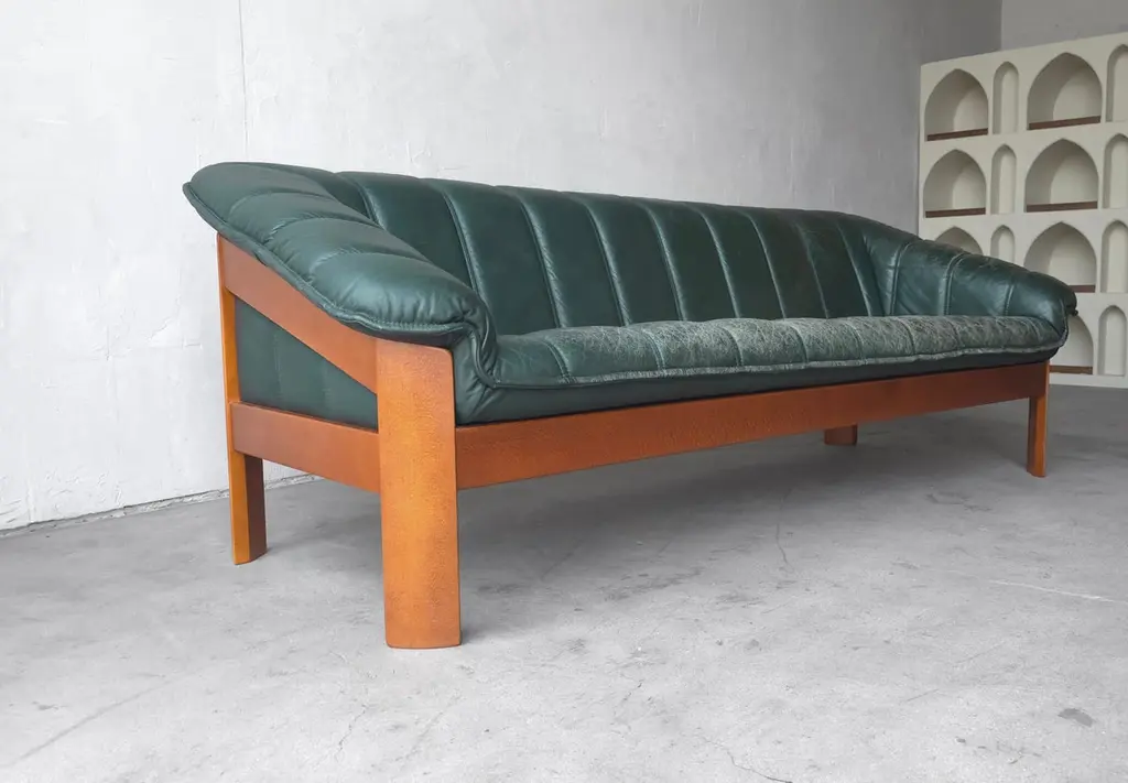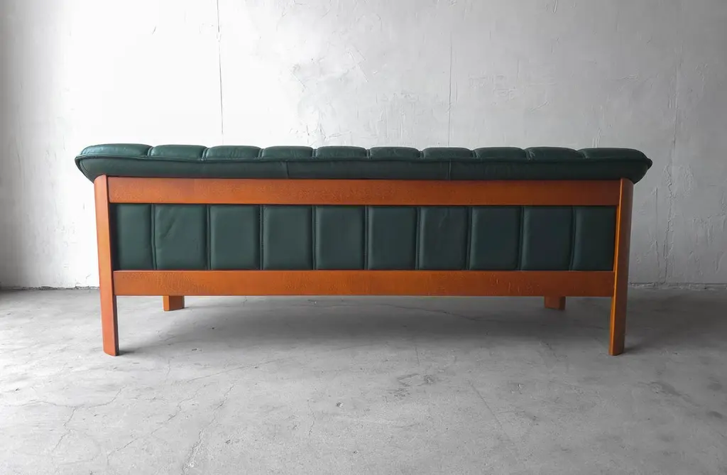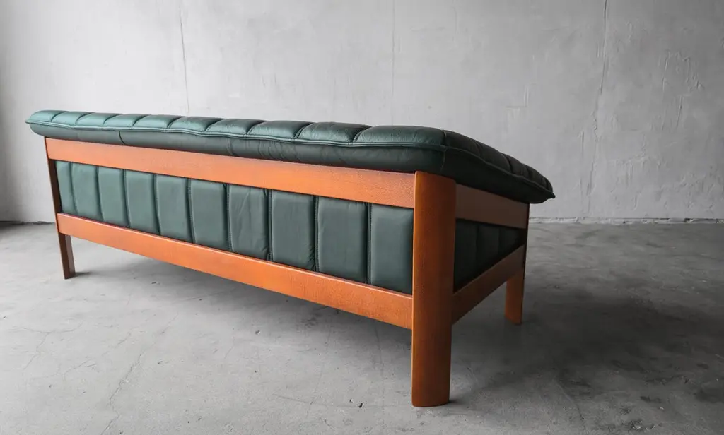 Teak And Green Leather Danish Sofa By Hjellegjerde