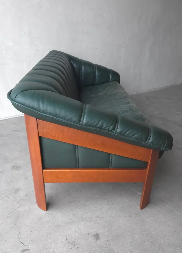 A perfect example of Scandinavian design. This Hjellegjerde sofa oozes style and craftsmanship, it features a channeled bucket style seat in dark forest green leather with nice patina and a substantial teak frame. This sofa has a very modern feel, similar to all the Italian sofas that have become increasingly popular.The sofa is in excellent vintage condition. The teak and all the structural components of this sofa are in as near mint condition as you can get. The leather has nice, consistent patina. Please see all images.