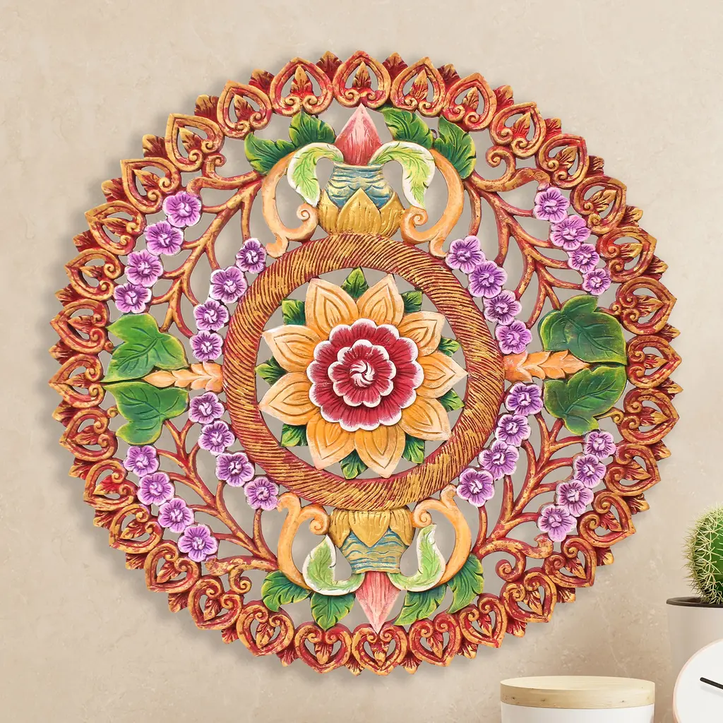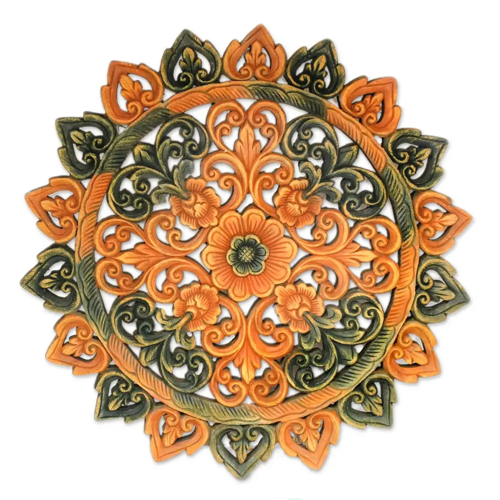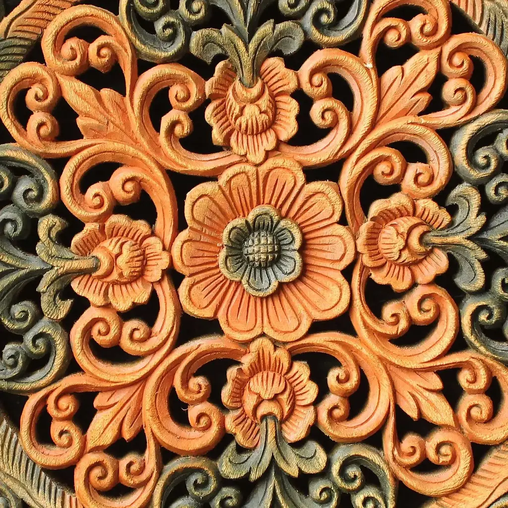 Radiant like the sun, this panel glows with pristine beauty. Tay Nontawat carves two different pieces of teak wood with a floral medley. When each is finished, he incorporates the two into one resplendent piece. Nontawat's carving excellence can be seen in the detail, which he achieves with a fine chisel and knife. After leaving the wood to dry, he applies color with lacquer paints.