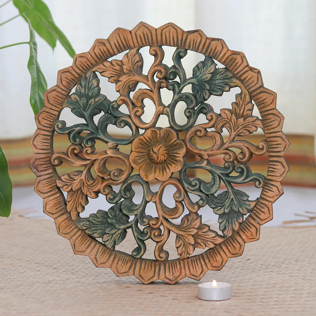 Centered by a perfect lamduan blossom, a floral medallion shows elaborate filigree in three dimensions. A burst of petals borders the delicate panel. Tay Nontawat sculpts the wall adornment of teak wood, using only hand tools. The finished piece is dried in the sun and protected with a coat of lacquer.