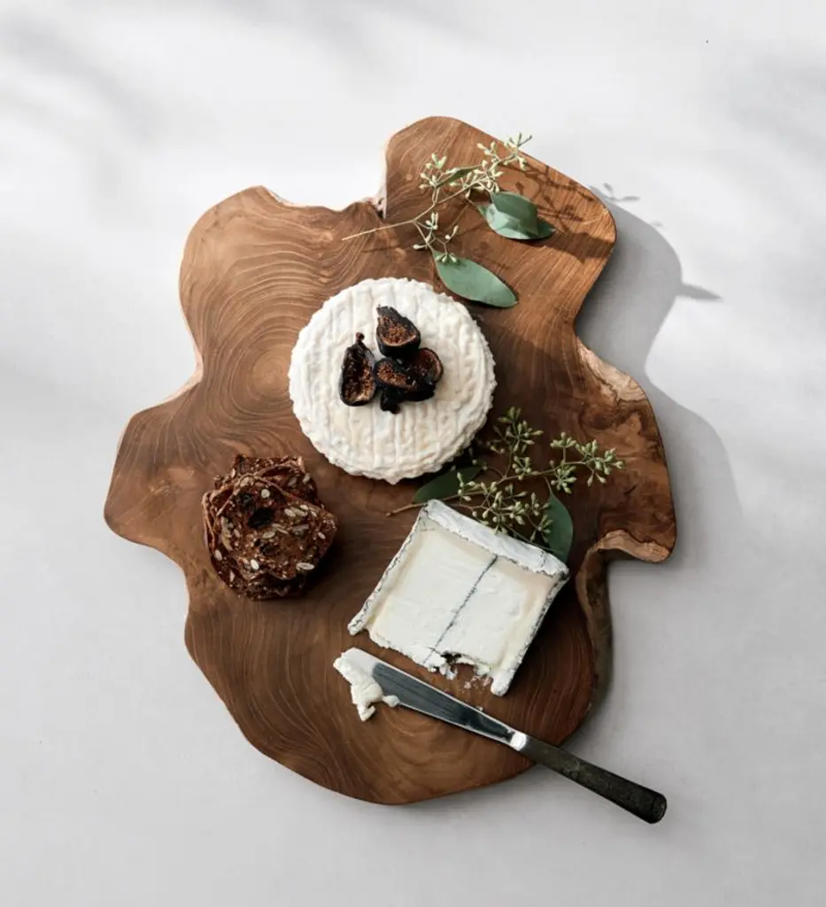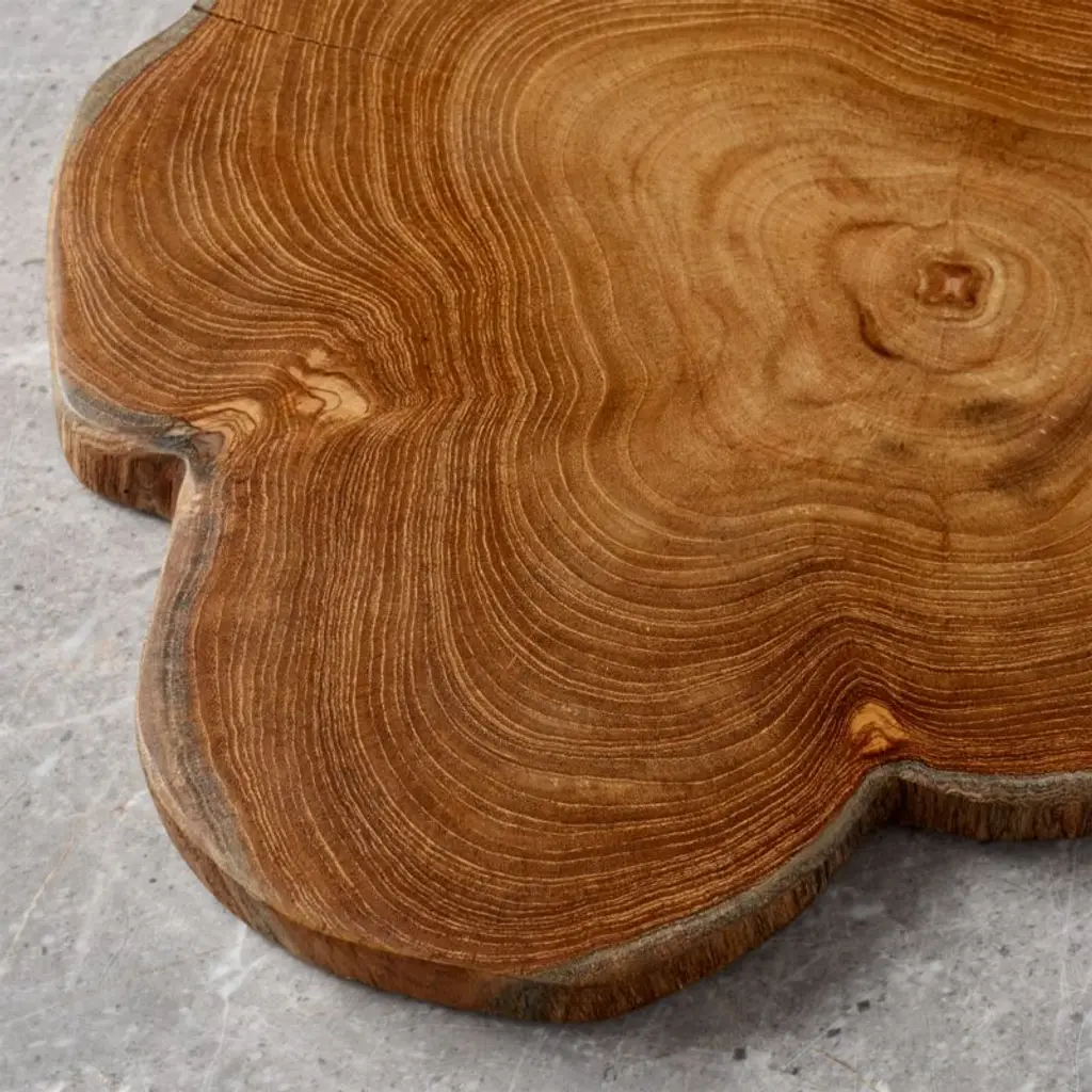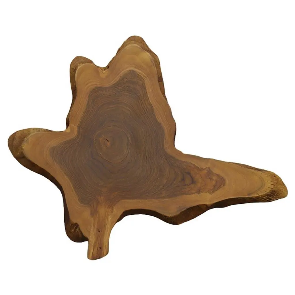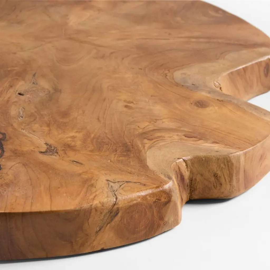 Fashioned from a cross-cut section of teak root, this natural serving board makes the most of the wood's irregular growth ring patterns and gnarled shapes. Laden with hors d'oeuvres, cheeses or charcuterie, this organic serving piece is sure to spark conversation. Each board will exhibit its own characteristics, varying slightly in color, shape and size.