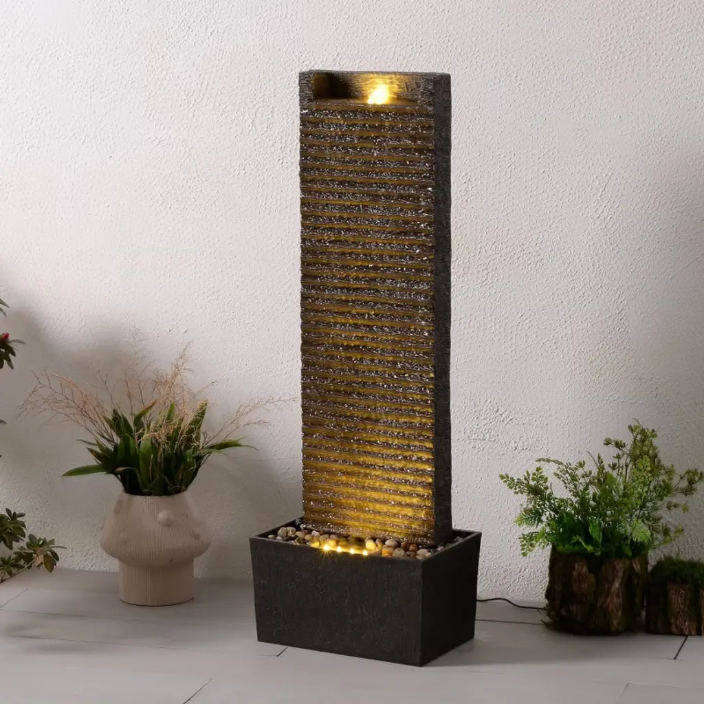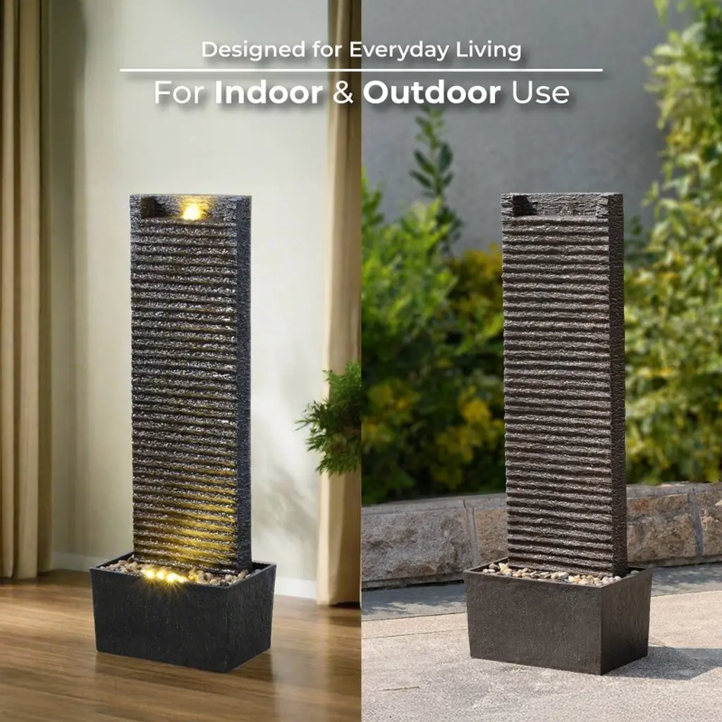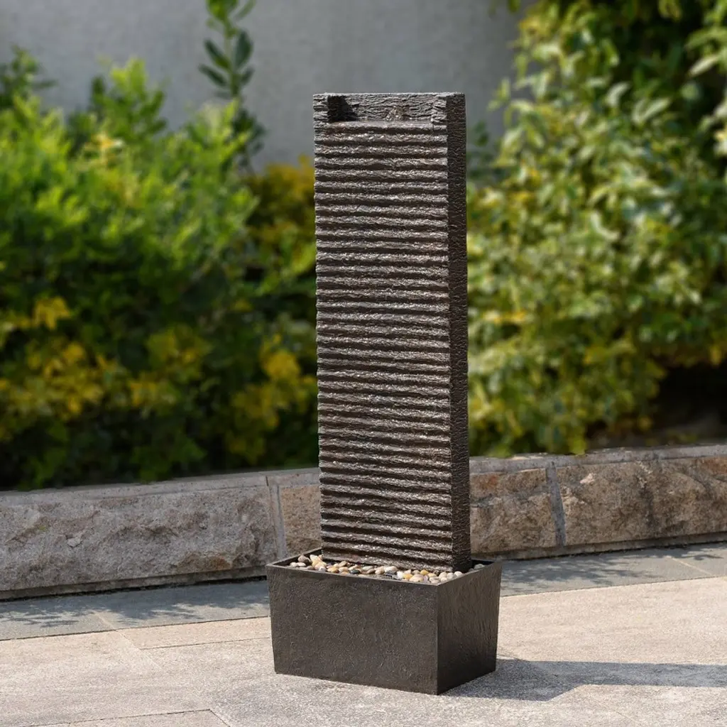 Add visual balance and calming sound to your outdoor space with this symmetrical modern water fountain. Its tall, sculptural form and flowing water create a relaxing focal point for patios, balconies, or garden corners. The dark gray finish and clean lines work beautifully with both minimalist and contemporary styles. Made from durable, weather-resistant polyresin, it's built to last season after season with minimal maintenance. Just plug it in, place it where it fits best, and enjoy the peaceful ambiance it brings to your space.