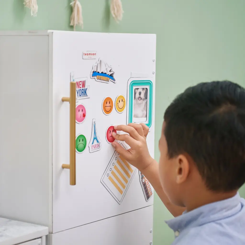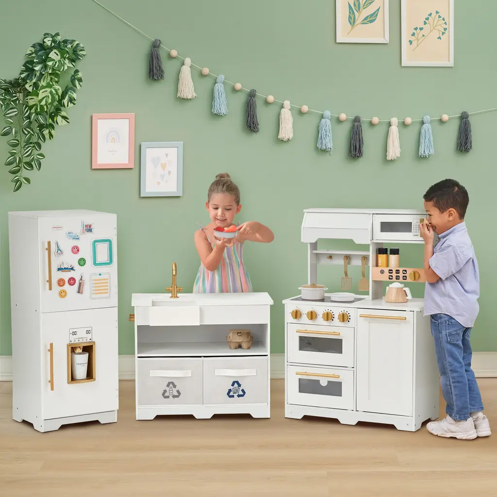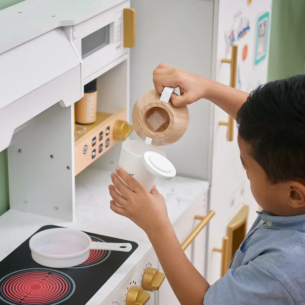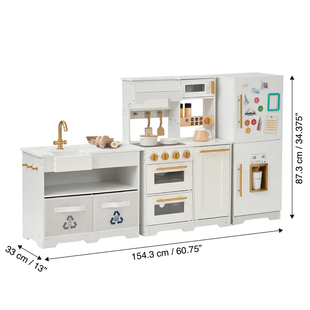 Bring the joy of everyday routines into your child’s world with the Little Chef Atlanta Modular Play Kitchen—a beautifully designed space where imagination, confidence, and creativity come to life. This modern wooden kitchen for kids features a stylish white and gold finish that complements your home just as much as it inspires your toddler. Thoughtfully made for children ages 1–5, this kids kitchen playset includes three freestanding wood units that you can arrange to fit any playroom or shared space. The interactive design offers realistic play features that kids love—clicking oven knobs, a magnetic fridge door, and a working pretend icemaker that drops play cubes. It’s a toddler kitchen that turns everyday routines into role play that builds life skills. With 17 accessories included—like pots, pans, utensils, a coffee pot, and wooden eggs in a carton—this toy kitchen delivers a complete setup for immersive pretend play. From serving up “meals” to organizing their own kitchen space, kids gain confidence, motor skills, and a sense of independence. It’s more than just a play kitchen set—it’s a launchpad for creativity and emotional growth. Crafted from durable wood and high-quality plastic, this kids kitchen wooden set is built to last through every pretend recipe, cleanup routine, and story your child creates. Whether you're searching for a play kitchen for toddlers 1–3 or a kitchen set for kids ages 1–4 and beyond, Atlanta is designed to grow with them. Give them a space that’s theirs—a wooden kitchen playset for toddlers that feels real, looks beautiful, and supports the skills they’ll use for life. Ready when they are. Features: