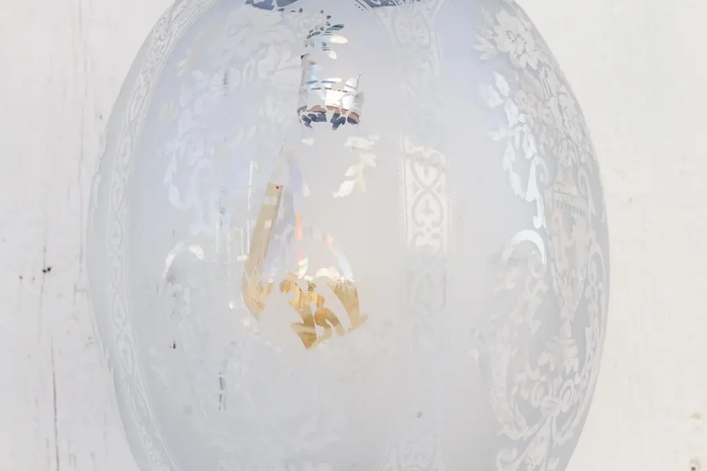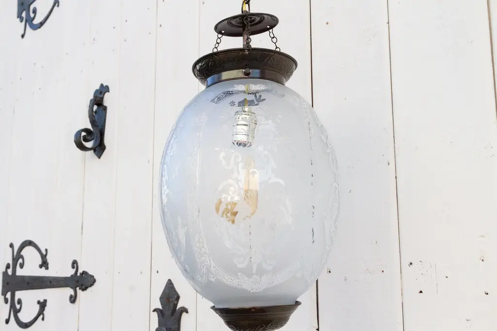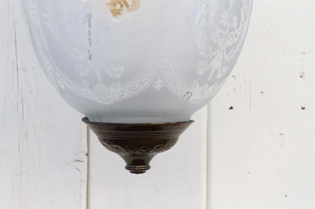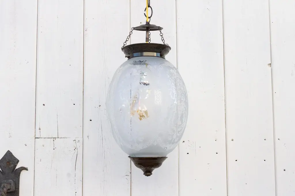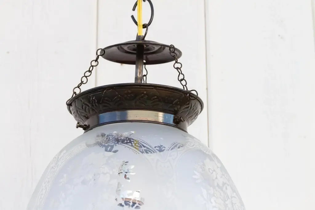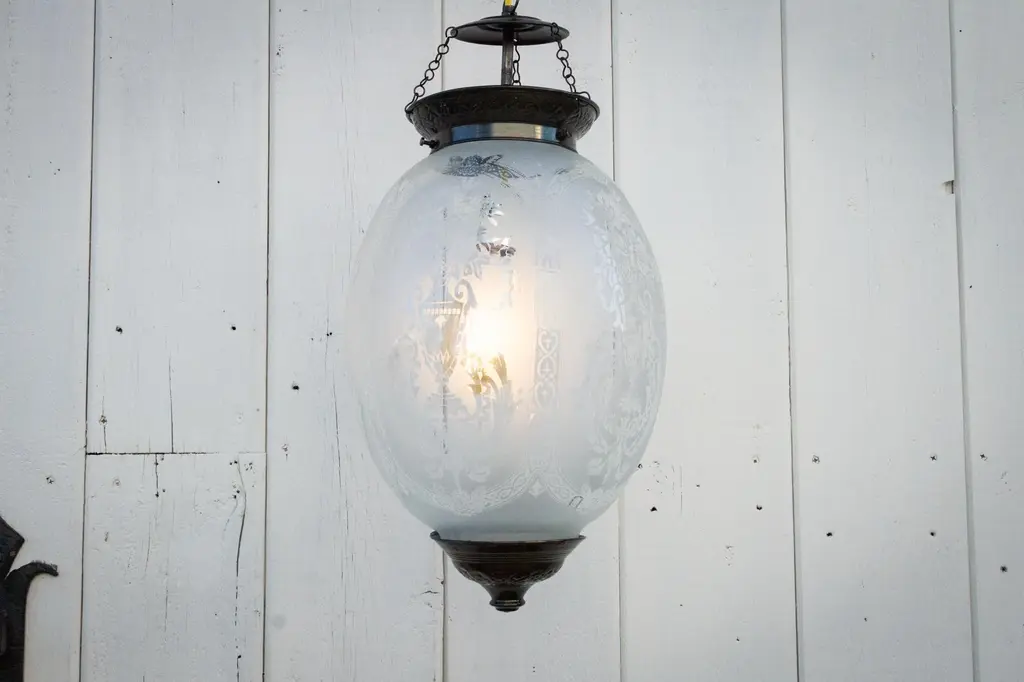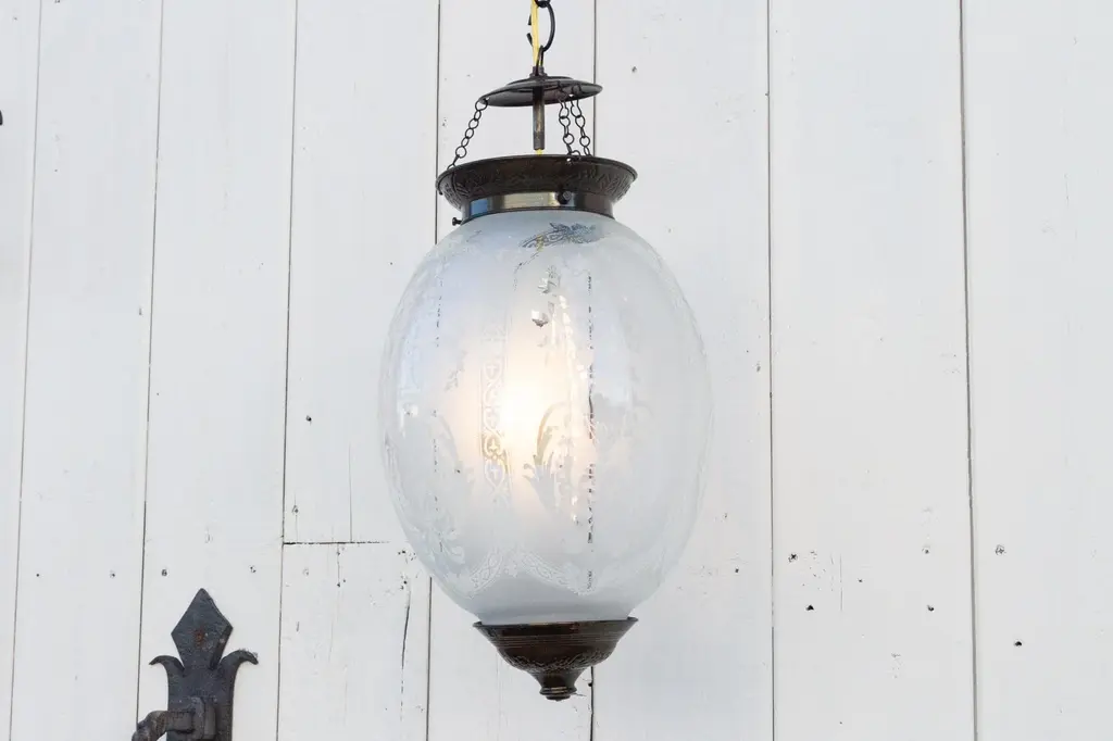 lear glass lamp with hand-etched floral designs. This lantern comes in two pieces with a glass canopy top chain-linked to the hanging lamp. May show minor imperfections, missing mosaics or minor chips. Please Note: Lantern does not come wired, light kit and bulb are not included. **Please bear in mind that colors of products shown may vary slightly from their original color due to monitor display settings or photography studio lighting.