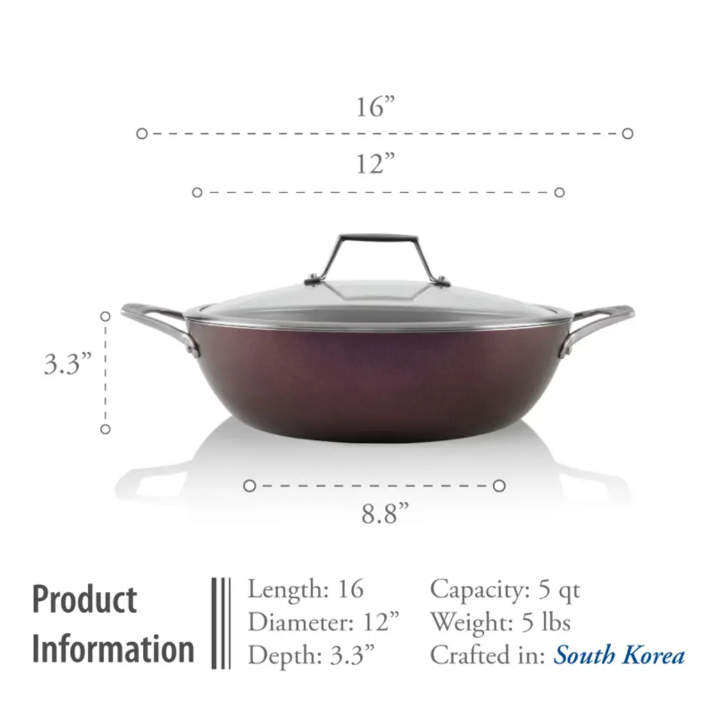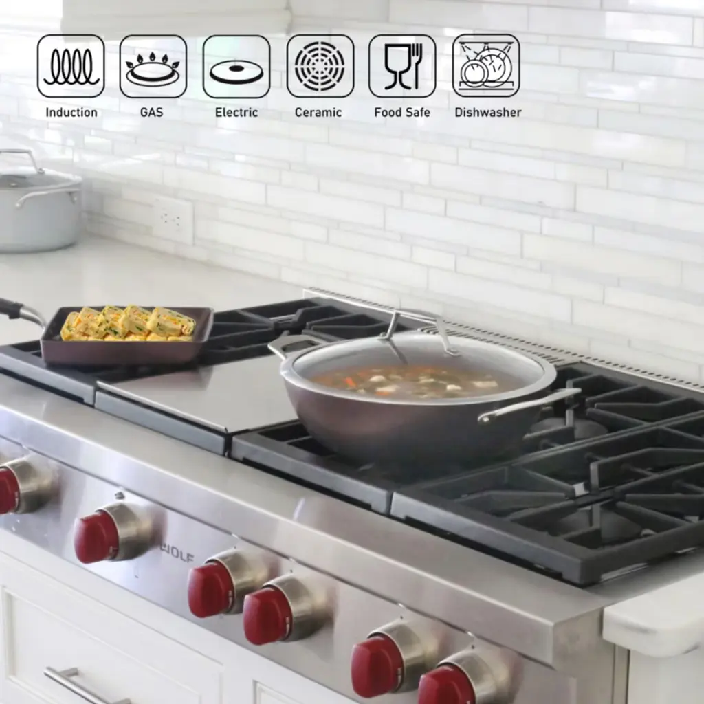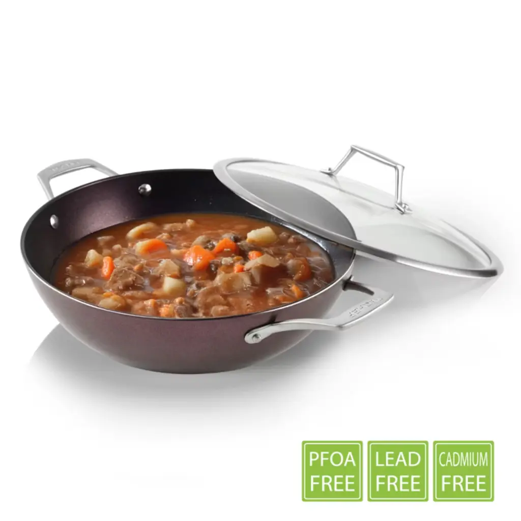 Elevate your cooking with this versatile chef's pan. Featuring a superior nonstick coating, even heat distribution, and durable construction, this pan is perfect for a variety of culinary tasks. Its wide, flat bottom and gently sloping sides provide ample cooking surface and allow for sauteing, frying, simmering, and stir-frying. The double-riveted stainless steel handle ensures strength and durability, while the stay-cool design provides comfortable handling. Suitable for all cooktops, including induction, this pan is oven safe up to 450°F and dishwasher safe for easy cleaning. With its included lid, this nonstick chef's pan is a must-have for any kitchen.