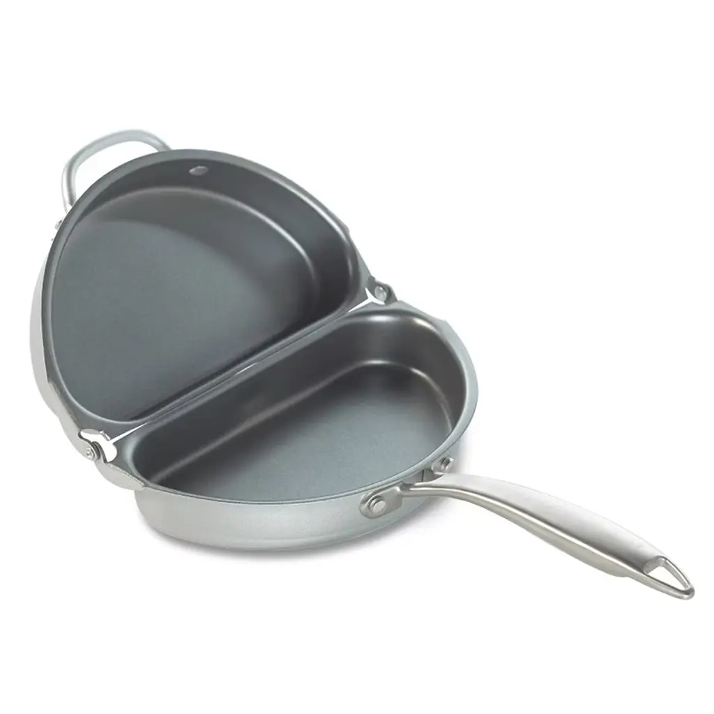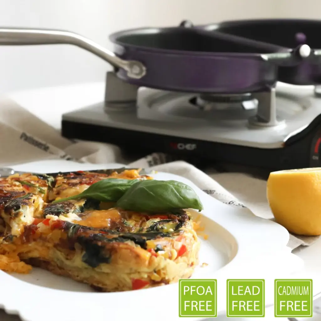 The double-sided Frittata Pan is the perfect tool for creating fluffy Italian frittatas or perfectly cooked omelets with ease. Designed for convenience, it allows you to effortlessly flip your frittata or omelet directly over the stovetop, ensuring the perfect shape and texture every time. Each side of the pan can cook different foods simultaneously, cook eggs on one side while sauteing veggies on the other, then simply flip to combine them. This time-saving design makes it ideal for busy kitchens. Made from forged heavy-gauge aluminum, the pan distributes heat evenly, preventing hot spots, while the 3-layer reinforced Platinum nonstick coating ensures effortless food release. It is free from PFOA, Cadmium, and Lead, promoting healthy cooking. With a double-riveted, stay-cool stainless steel handle for added durability, the pan is oven safe up to 450°F and dishwasher safe for easy cleaning. Available in two vibrant colors, Black and Purple, this pan adds both functionality and style to your kitchen. Whether you're making frittatas, omelets, panini sandwiches, or pancakes, this versatile pan delivers outstanding performance for all your cooking needs. Suitable for all stovetops except induction.
