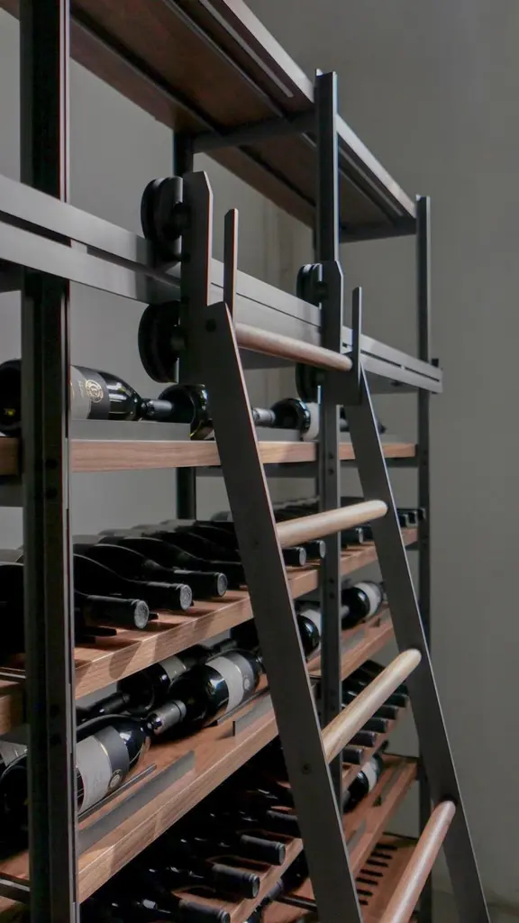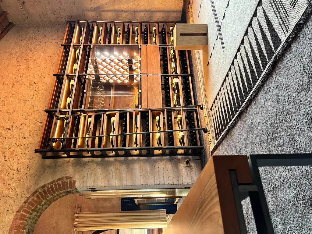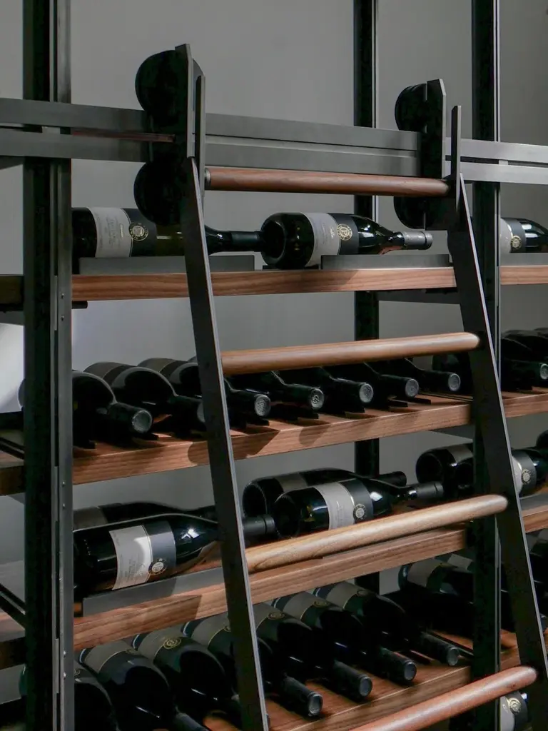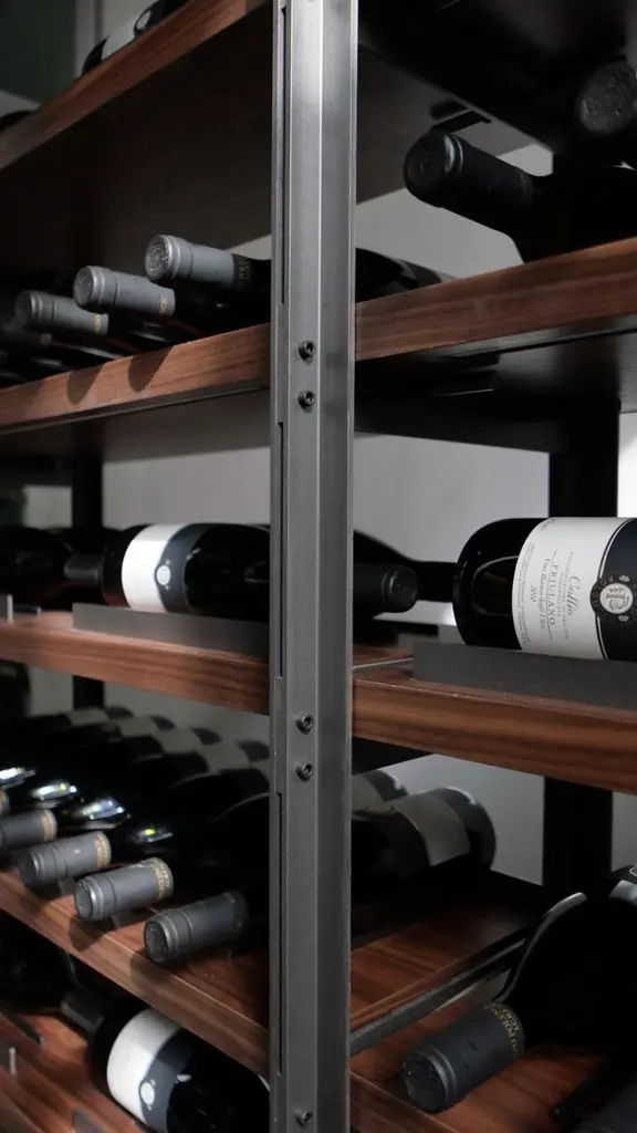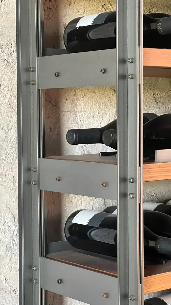DESSIE' company's mission is putting a contemporary spin on the old tradition of cabinet-making, in order to offer pieces of furniture ready to get people excited and to satisfy aesthetic and functional values of the contemporary way of living. Dessie' was started during 1990s and now proposes a collection of pieces of furniture inviting to discover a sophisticated and elegant design, an unique style where different influences merge, and to re-create a simple and refined design atmosphere for unconventional people who are freely looking for essential and high quality pieces.Winery system with shelves in walnut finish with derlin fittings to be used as a rack or as a display unit for bottles. Each version is available with led lighting system. Metallic vertical supports and fittings in antique nickel finish. Can be made according to design. Special sizes on request.DIMENSIONS:W 270 x H 251,2 x D 35 cm