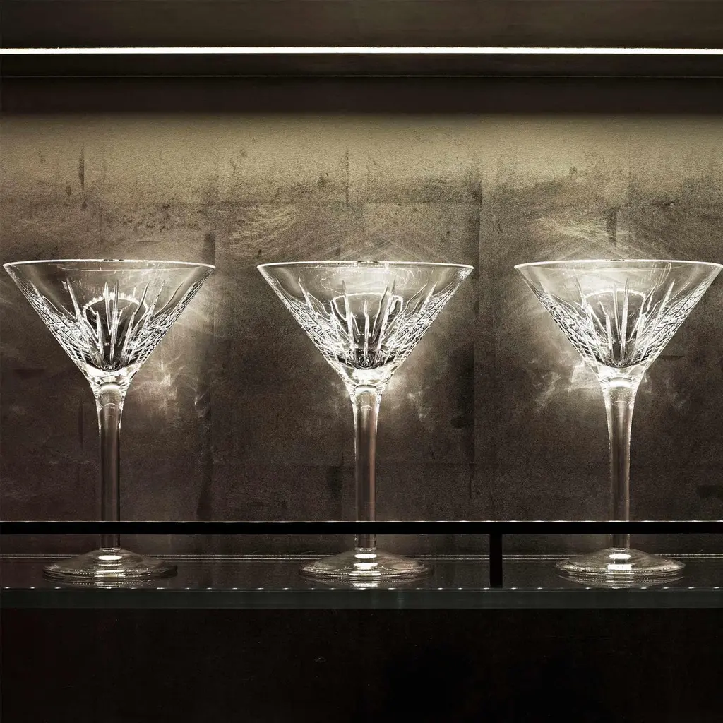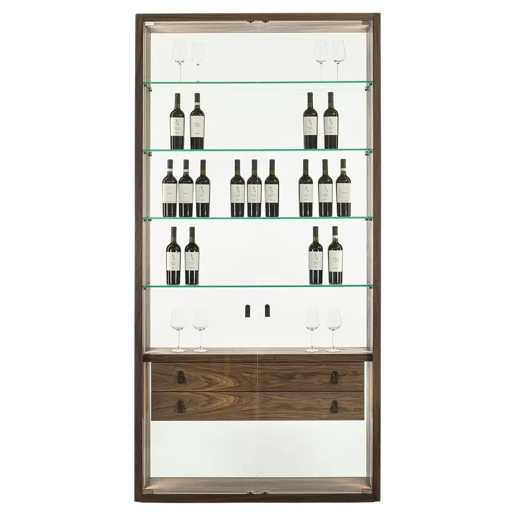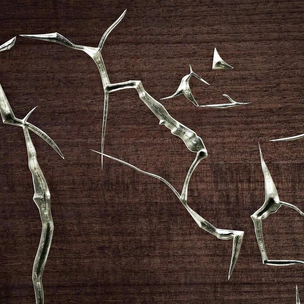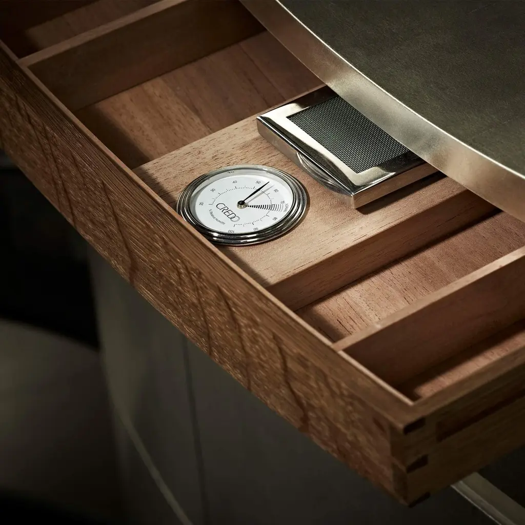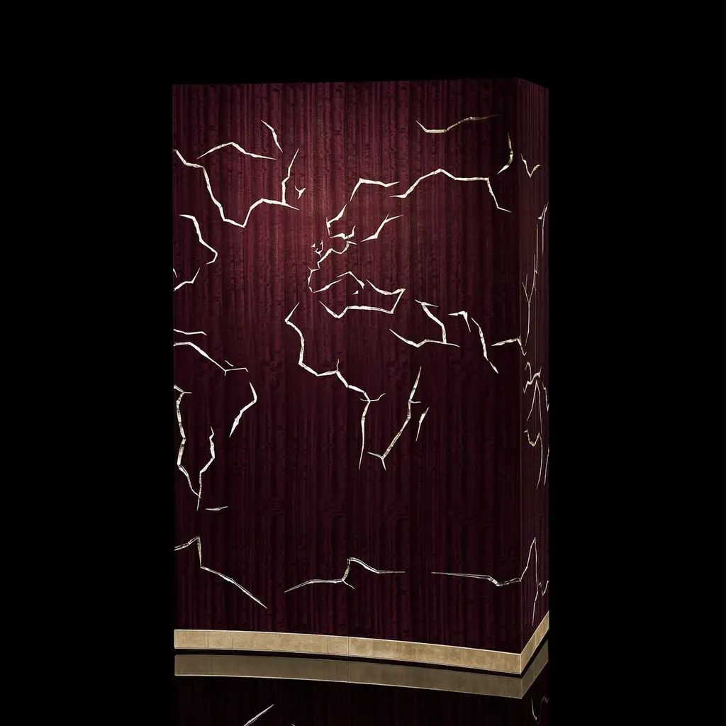 Exquisitely crafted in ebonised walnut with white gold effects and nickel accents, the Tectonic Bar embodies superlative quality and innovative design whilst epitomizing the intricacy and precision of fine craftsmanship at its best. The walnut skin of the Bar appears to split as if tectonic plates beneath the earth have broken it apart to reveal the glowing metallic core within.Cracks in the surface reveal metallic rivets, form the outlines of the continents of the World in a conceptual and abstract manner. A secret button is employed to unlock the Bar cabinet enabling the doors to open, setting a mechanism in motion to rotate the Bar columns, revealing specialist LINLEY cocktail accessories (included) ; everything you need to create a bespoke cocktail of choice. Stemware not included In true LINLEY style, there are other secrets hidden inside, including a fridge and, buried in the depths of the Bar, a cigar humidor which rises up as if from the centre of the molten Earth.