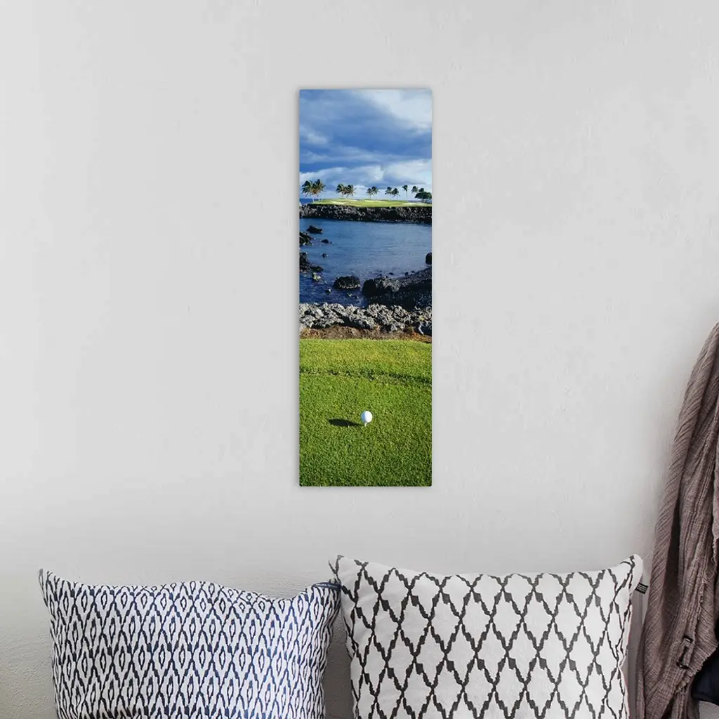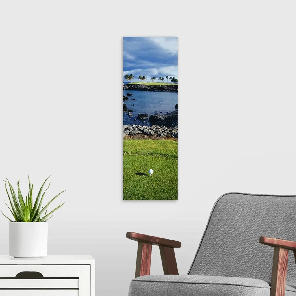 Tall panoramic photo of a golf ball, the shot lined across a small inlet towards a patch of palm trees and sand traps.