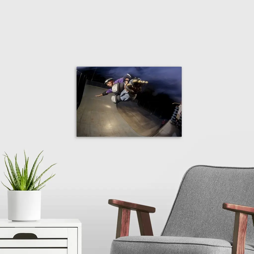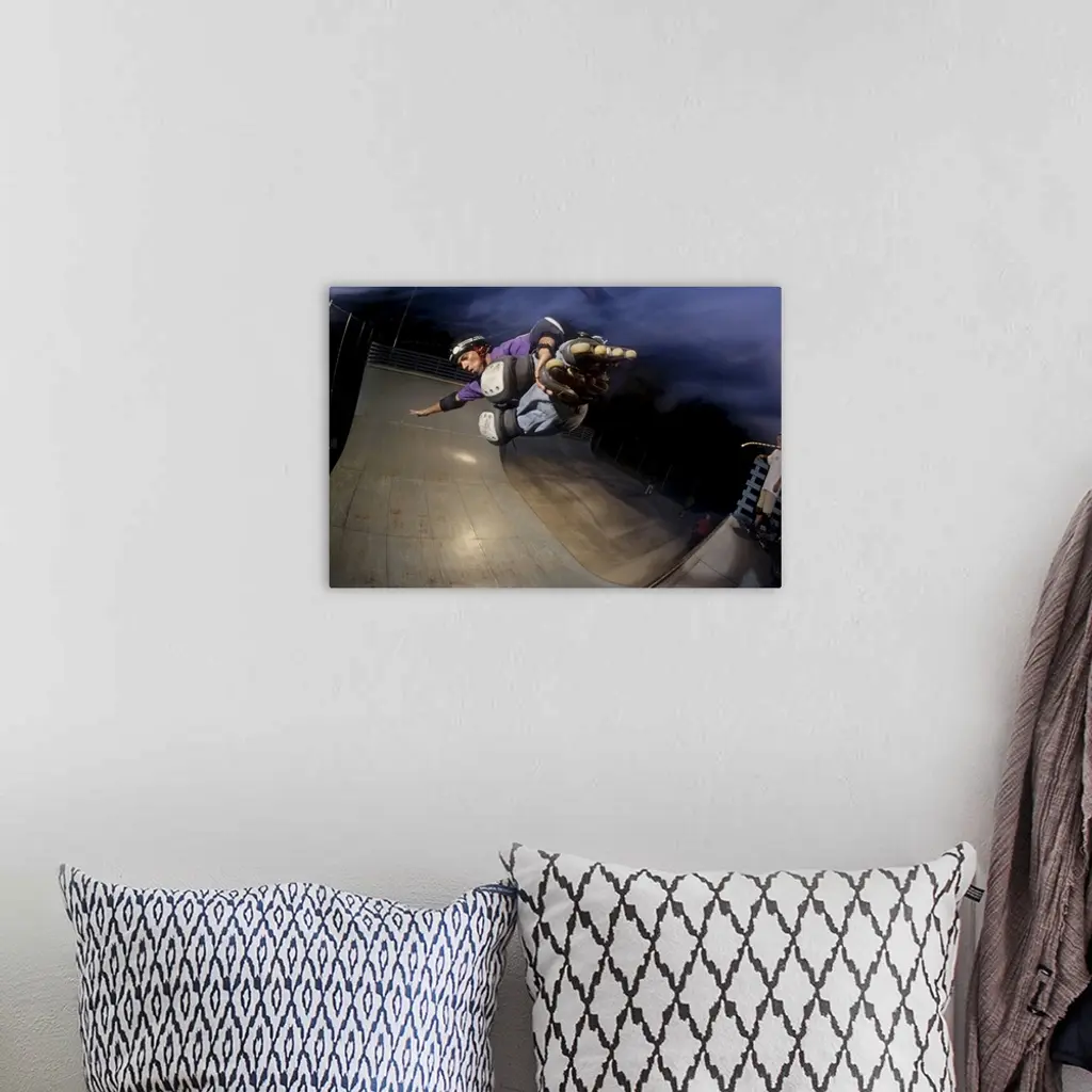 Teenage boy inline skating on the vert ramp wall art for home and office decor. Discover canvas art prints, photos, mural, big canvas art and framed wall art in GreatBigCanvas.com's varied collections.
