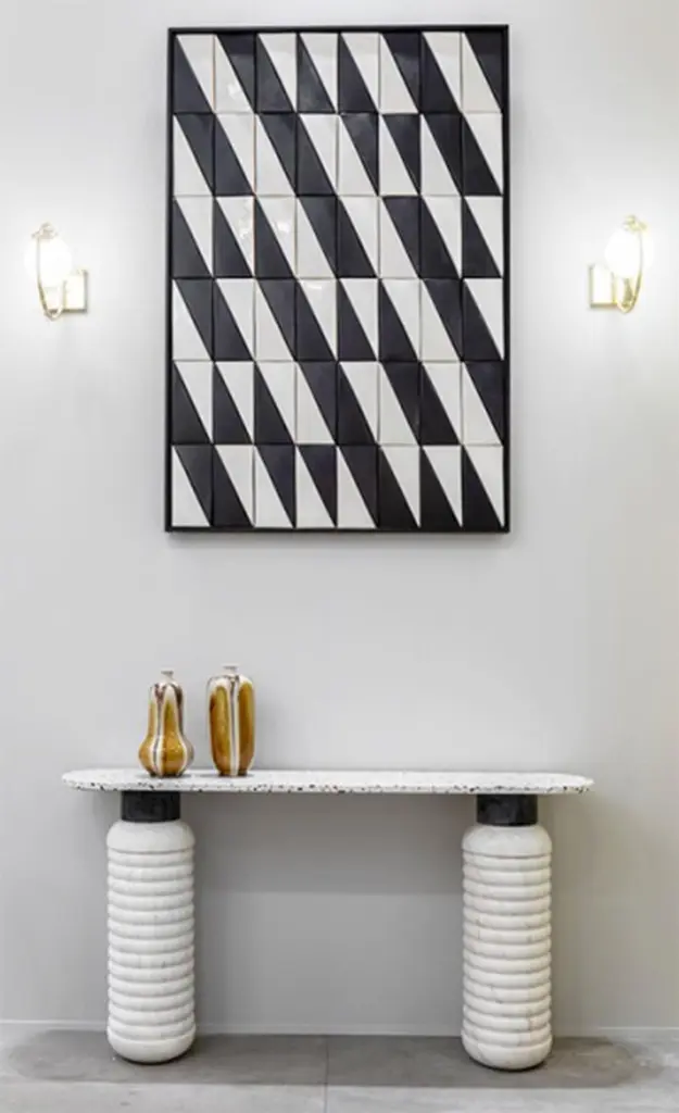 This handmade decorative tile panel combines the traditional Portuguese faience tile making techniques with a modern approach of shapes and color, resulting in a very visually impacting piece, which will bring life to any wall and for sure never going out of style. Made to Order.