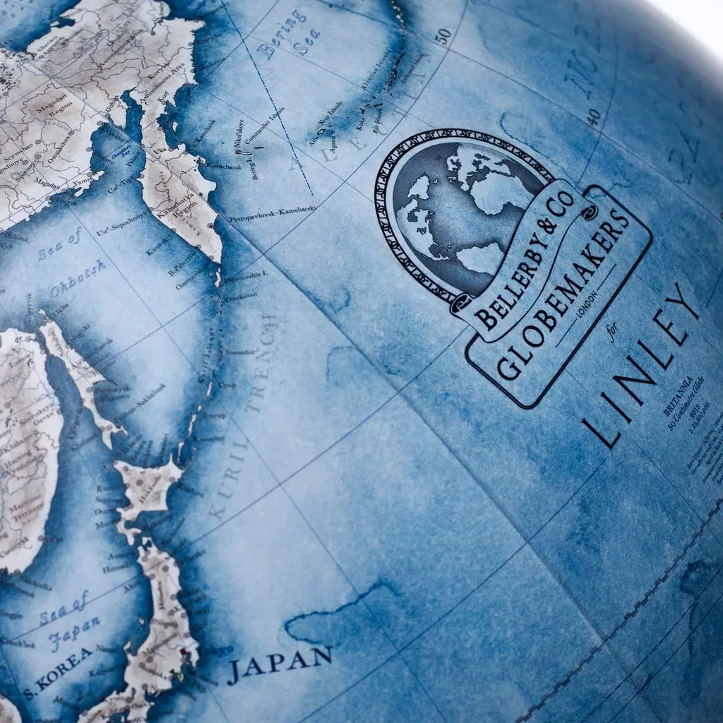Continuing our collaboration with famed globe makers Bellerby & Co., LINLEY have fashioned the Tellus Globe.This striking piece features a 50cm diameter globe elevated on a dark grey, figured anegre, veneered stand with polished steel caps, elegant brace detailing and a highly polished aluminum base. The globe rests on three roller bearings, which allow for a fluid and unimpeded 360-degree motion.The large orb is meticulously hand painted using Sennelier watercolor pigment with a UV- and scratch-resistant resin coat. Honey is added to the pigment, giving the paint an incomparable brilliance and smoothness.Based in Stoke Newington, Bellerby & Co. are artisan globe makers, whose founder Peter's unfulfilled search for the perfect globe to gift to his father resulted in the beginnings of the company.Much like LINLEY, no two Bellerby & Co. designs are the same, making this a perfect partnership.