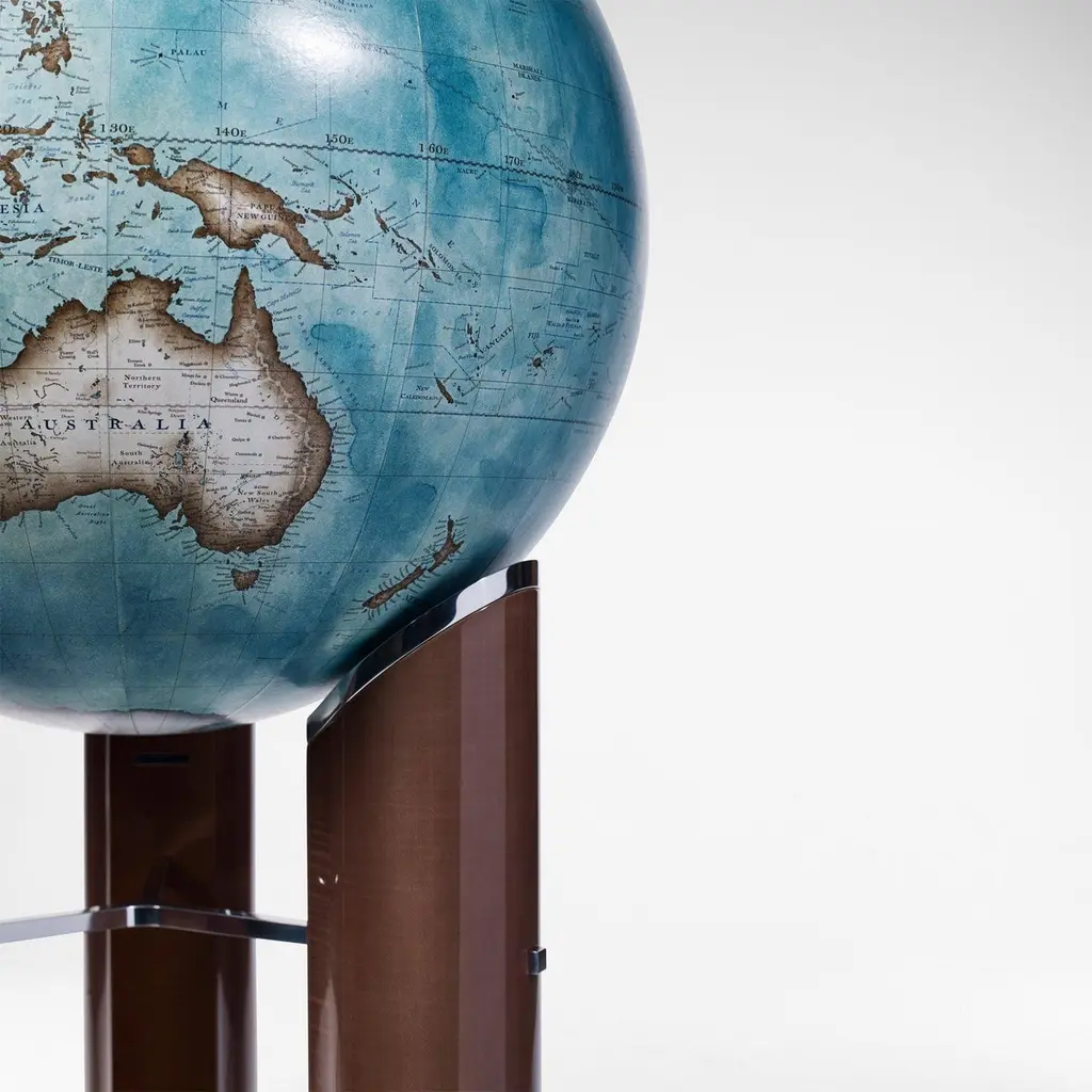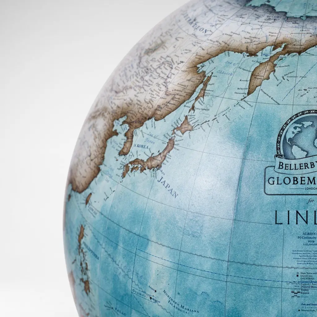 This striking piece features a 50cm diameter globe elevated on a sycamore dusk veneered stand with caps, brace detailing and a highly polished base in aluminium brass. The globe rests on three roller bearings, which allow for a fluid and unimpeded 360-degree motion.The large orb is meticulously hand painted using Sennelier watercolor pigment with a UV- and scratch-resistant resin coat. Honey is added to the pigment, giving the paint an incomparable brilliance and smoothness.Based in Stoke Newington, Bellerby & Co. are artisan globemakers, whose founder Peter's unfulfilled search for the perfect globe to gift to his father resulted in the beginnings of the company.Much like LINLEY, no two Bellerby & Co. designs are the same, making this a perfect partnership.