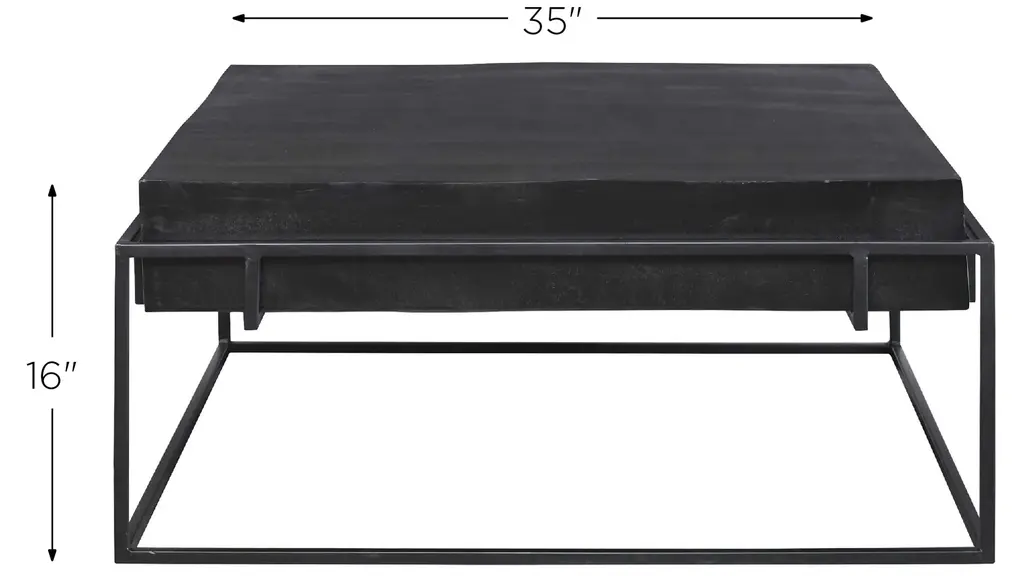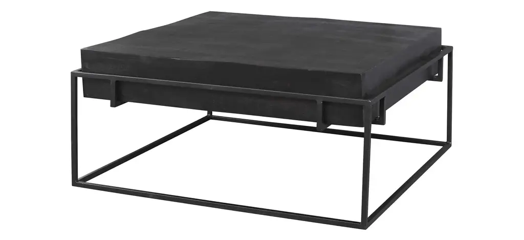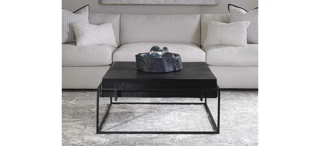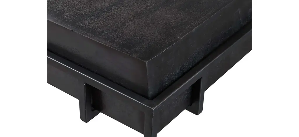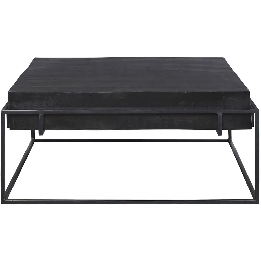 With modern minimalist styling, this Telone Coffee Table features a thick cast aluminum top with natural texturing finished in a plated antique black, resting in a coordinating aged black iron base.
