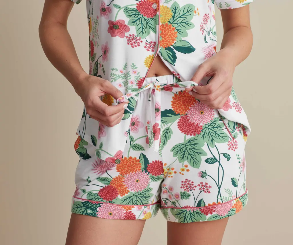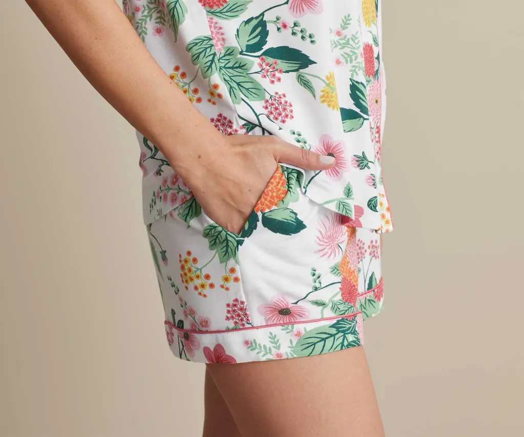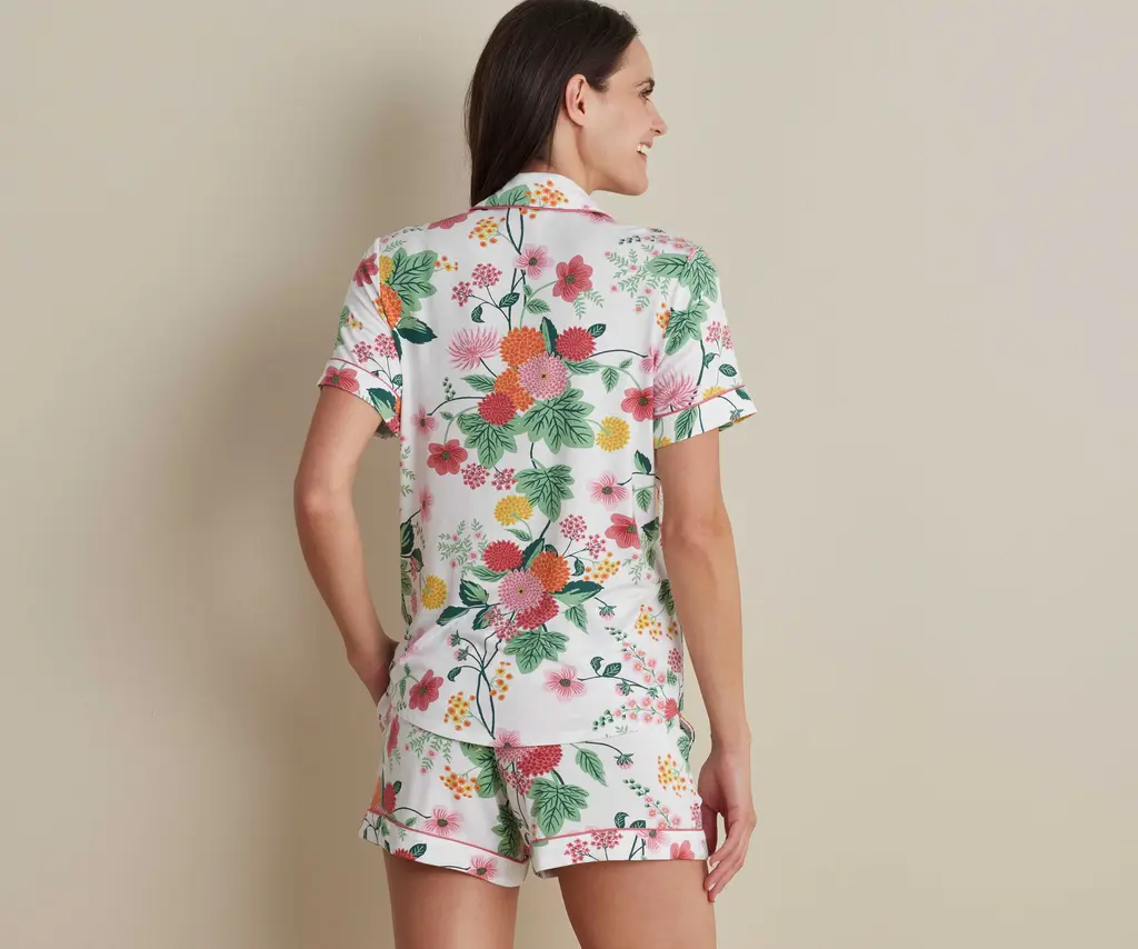 Cozy up in this two-piece pajama set, featuring our vintage floral-inspired Dahlia pattern. Soft, drapey, and breathable, Tencel material is designed for maximum comfort. The short-sleeve top features a notch collar and contrast piping, while the shorts feature pockets and an elastic draw-string waist. Part of the Rifle Paper Co. x The Company Store collection. While the collection fits true to size, we recommend using the fit guide as a reference.