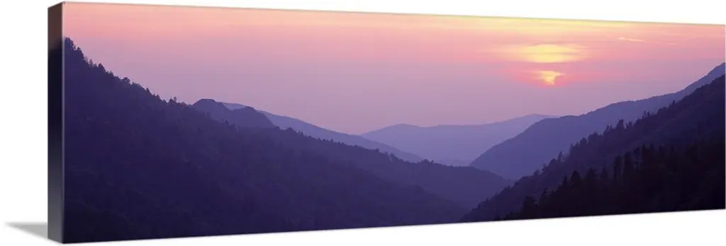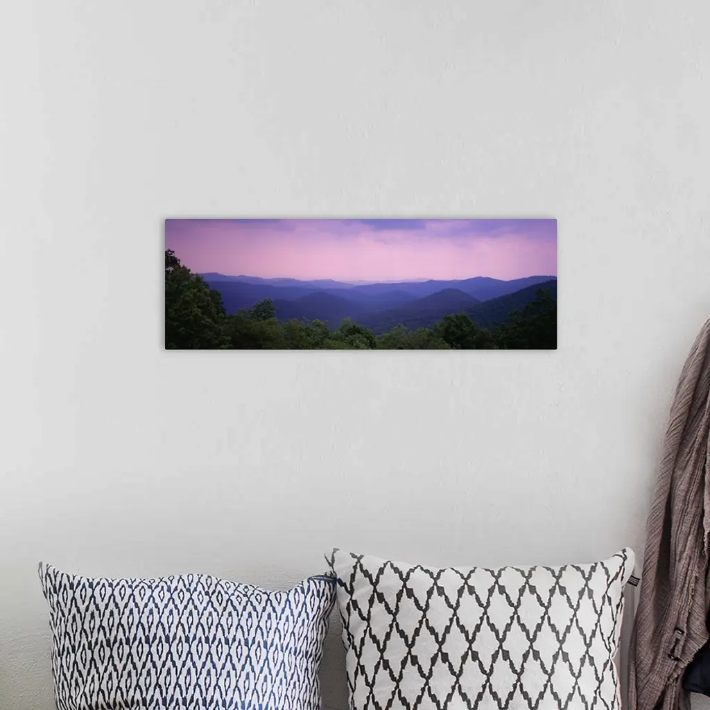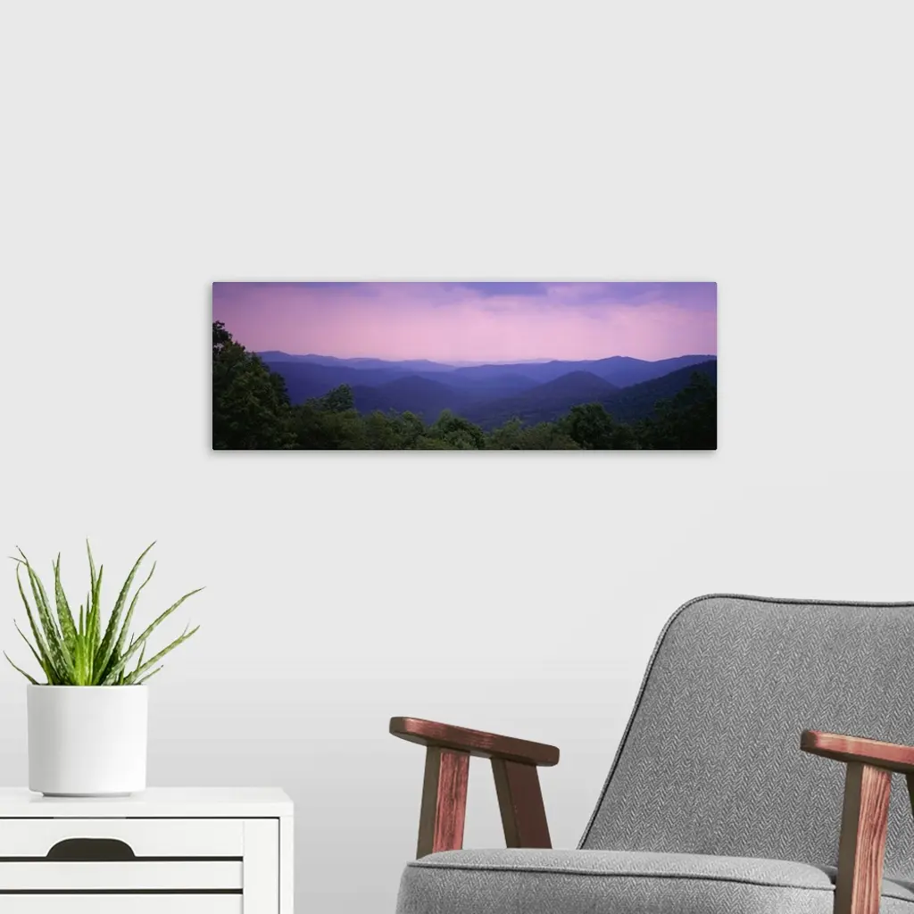 Wide angle photograph taken of the smoky mountains with some trees lining the bottom of the picture.
