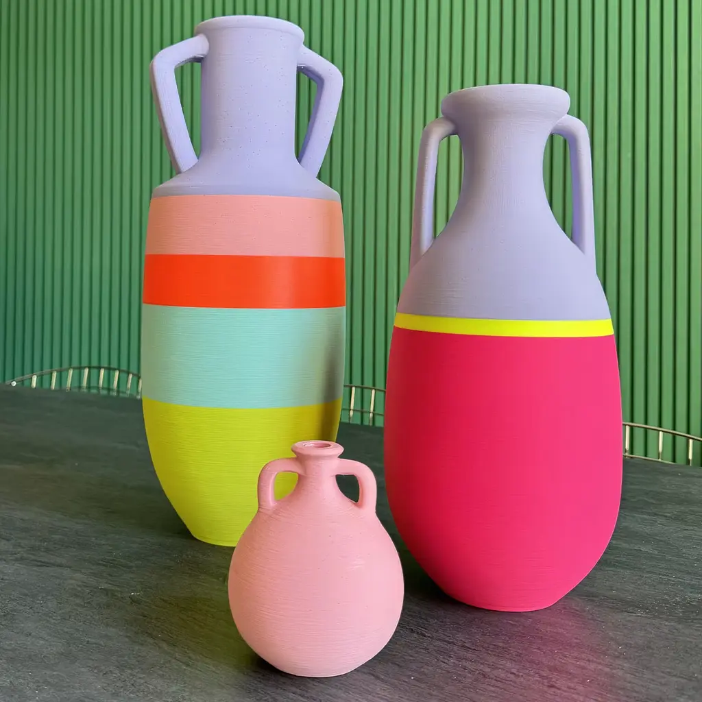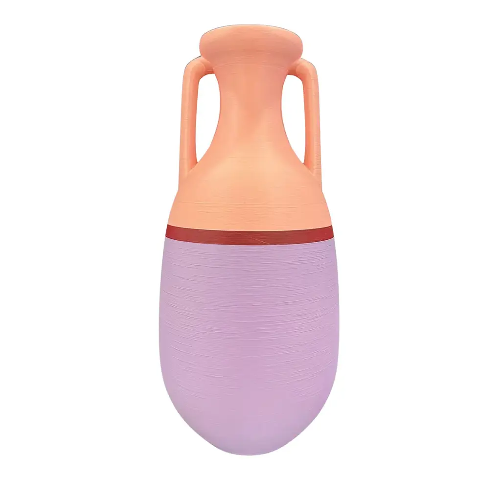 Pop reinterpretation of archetypal design. This vase is inspired by the Roman amphora typology by Heinrich Dressel, based on findings from the Monte Testaccio archaeological site in Rome. Made using 3D printing technology, it transforms PLA filaments into an iconic classical silhouette. Crafted exclusively with high-grade PLA, a thermoplastic derived from renewable resources and compostable in industrial facilities. The vase features an elegant combination of Purple, Lime and Lilac colors.