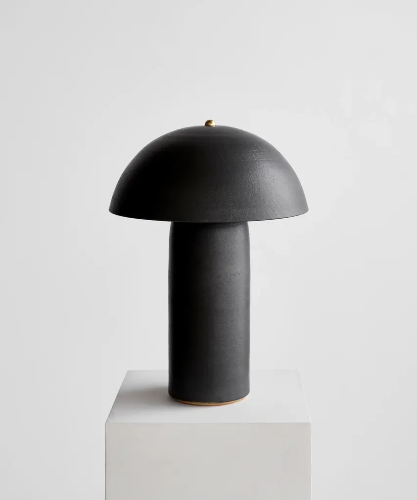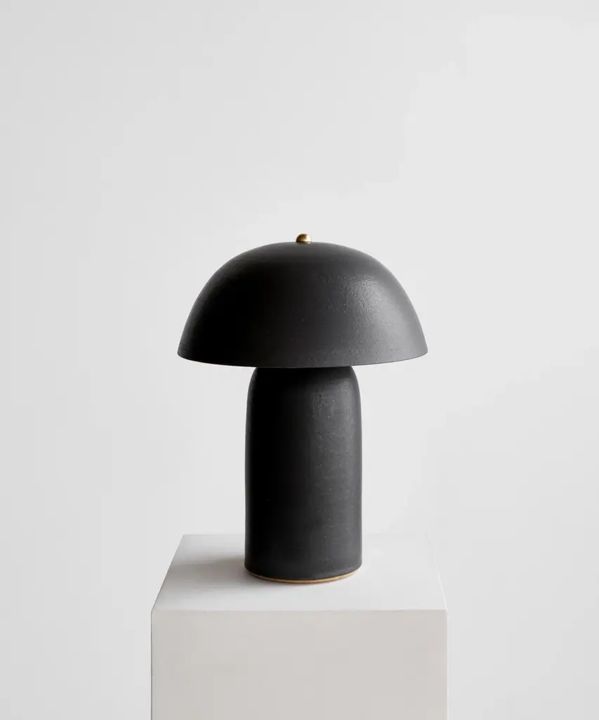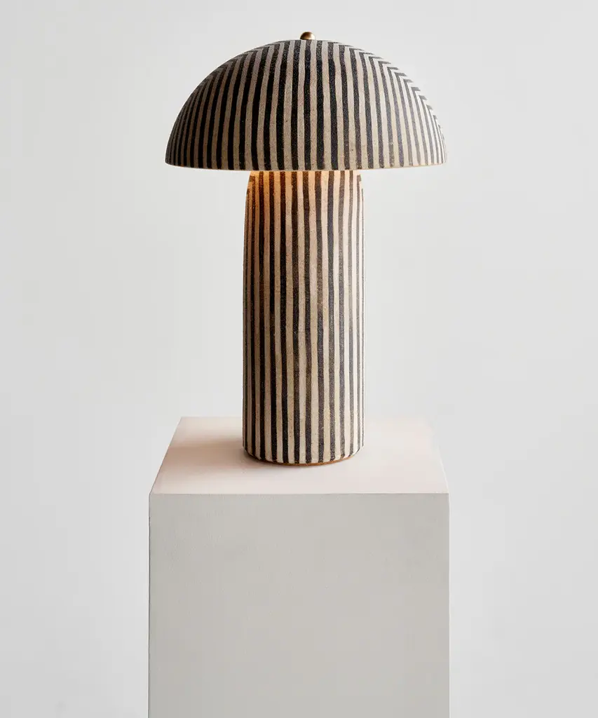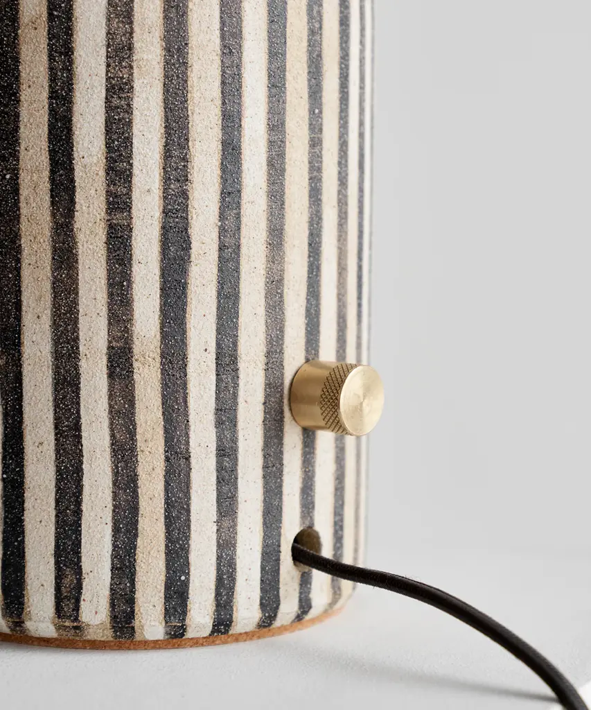 The Tera Lamp is a staple in the Ceramicah collection. Each Tera Lamp is made of a wheel-thrown ceramic shade and ceramic base, brass hardware, a dimming switch, and LED light bulbs. Striped based with black glazed shade. Each stripe is hand-painted in a matte underglaze that allows the texture of the stoneware to come through giving it a polished yet organic look. Ceramicah is a Los Angeles ceramics studio by Micah Blyckert and Alexandra Cadiz. Both former Architects, the pair is influenced by their love of organic forms and textures, as well as the landscape of California.