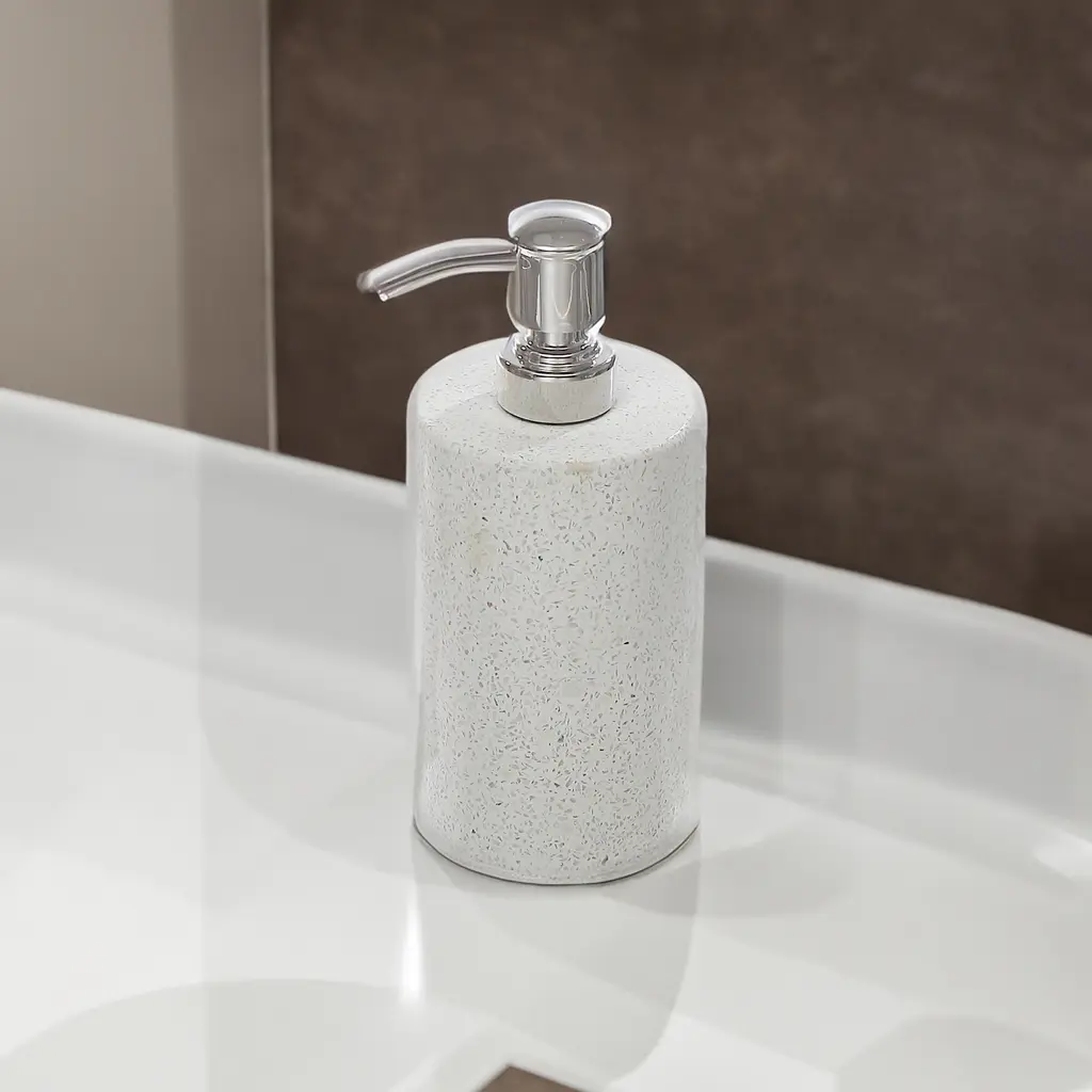 Transform your bathroom into a spa-like haven with the Terrazzo Lotion Dispenser. Crafted from natural stone, the lotion pump comes in a serene white color that complements most decor themes. Apart from its functional use, the stoned surface offers unwavering durability and a luxe appearance. It enhances the ambiance of your available mirror space.