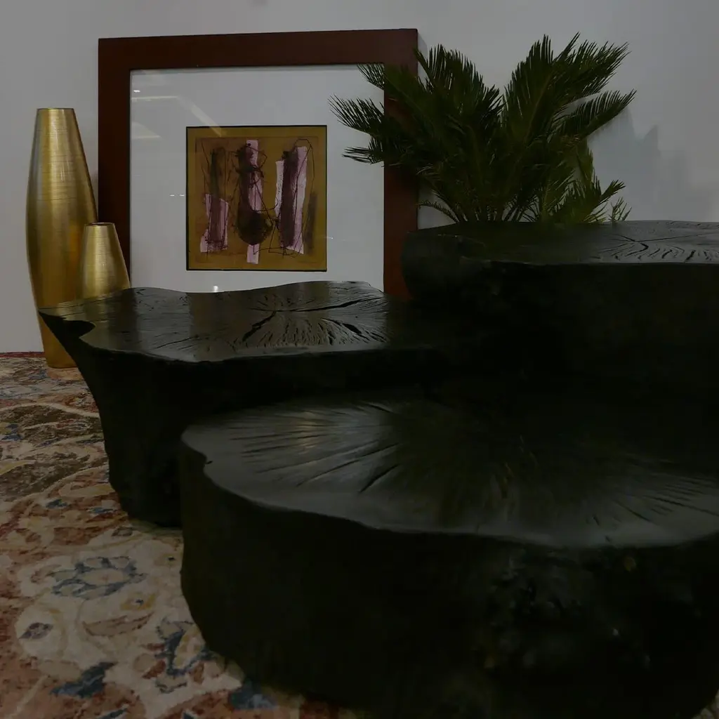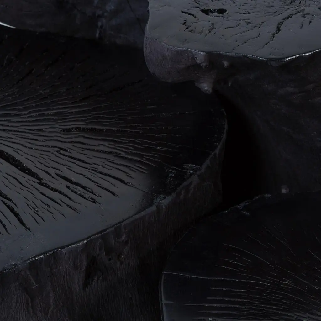 The unrivaled charm of nature captured in elegant shapes defines this set of three coffee tables. The set, minutely obtained from a single oak stump and dyed in black, makes for a sublime complement piece for rustic-chic decors. Offered in three different heights for a dynamic ensemble, it allows to lay trays while displaying decorative candles or vases.