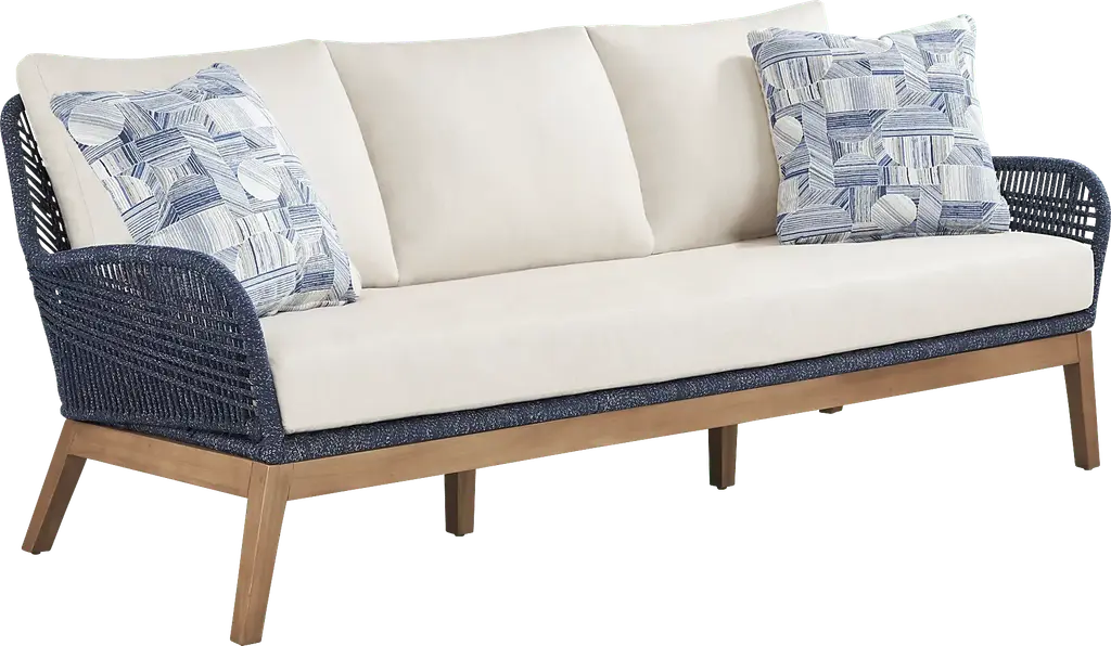 Intricately refined with contemporary flair, the Tessere seating set is a stylish choice for any outdoor space. Each piece features rustproof aluminum seats and arms wrapped in blue marine-grade polypropylene rope for exquisite style. Beige cushions upholstered in outdoor performance fabric offer the perfect touch of durable softness. To finish the look, two matching chairs provide plenty of extra room to relax. Cocktail table not included.