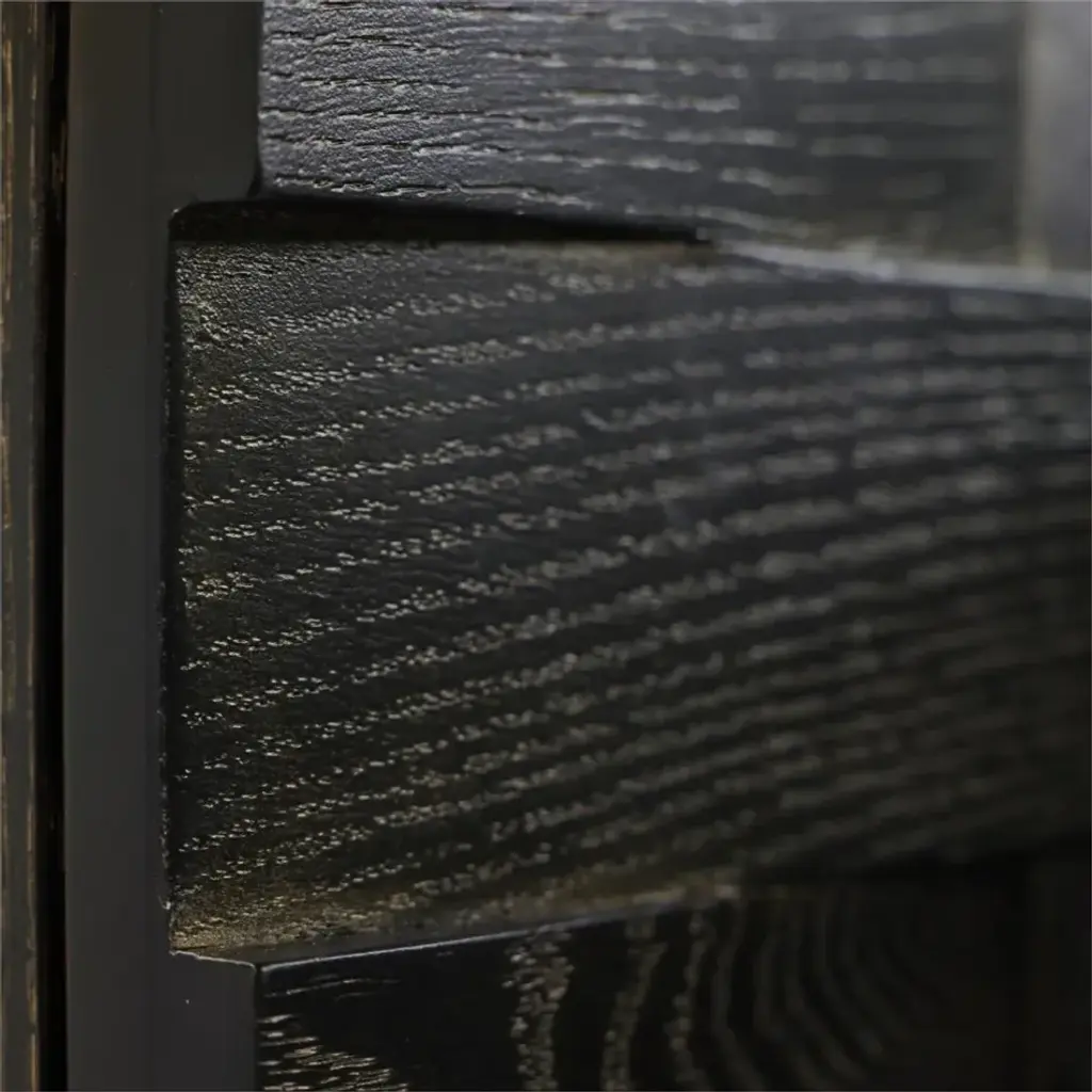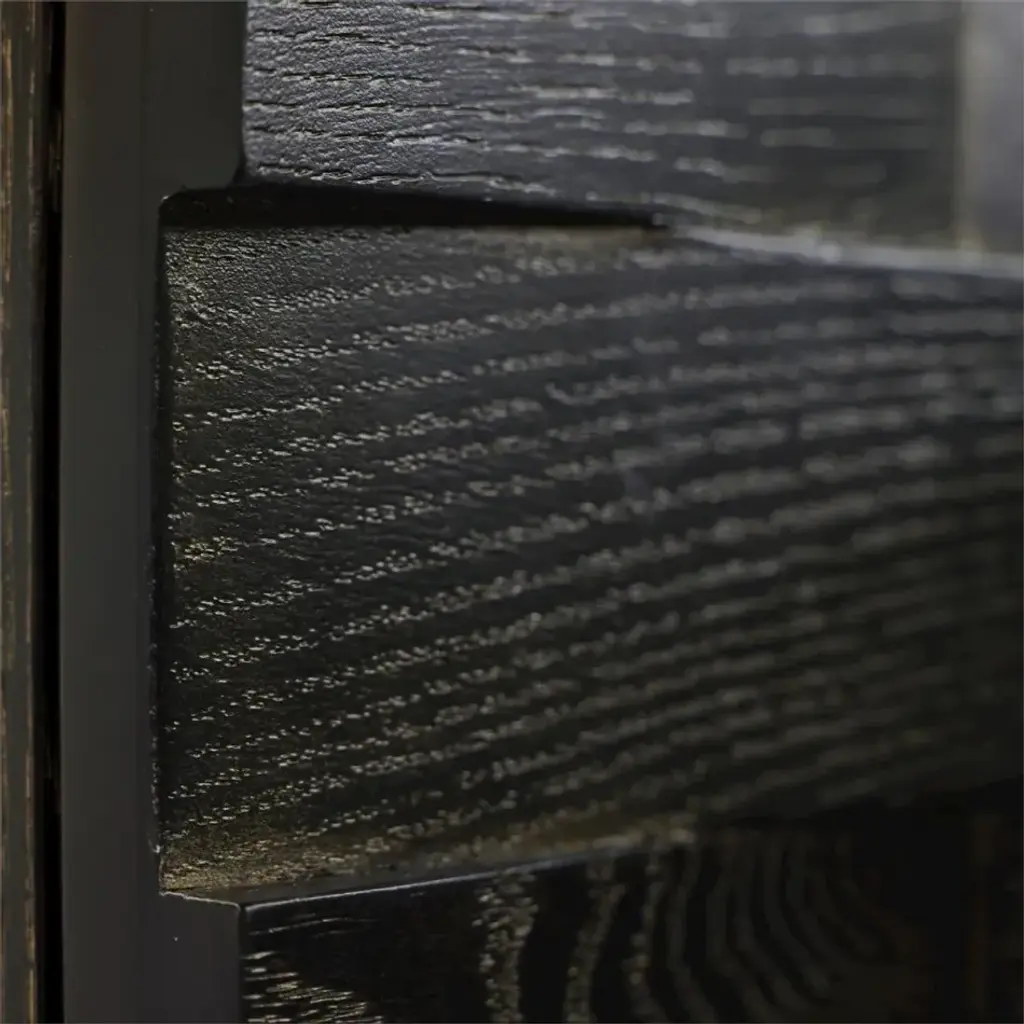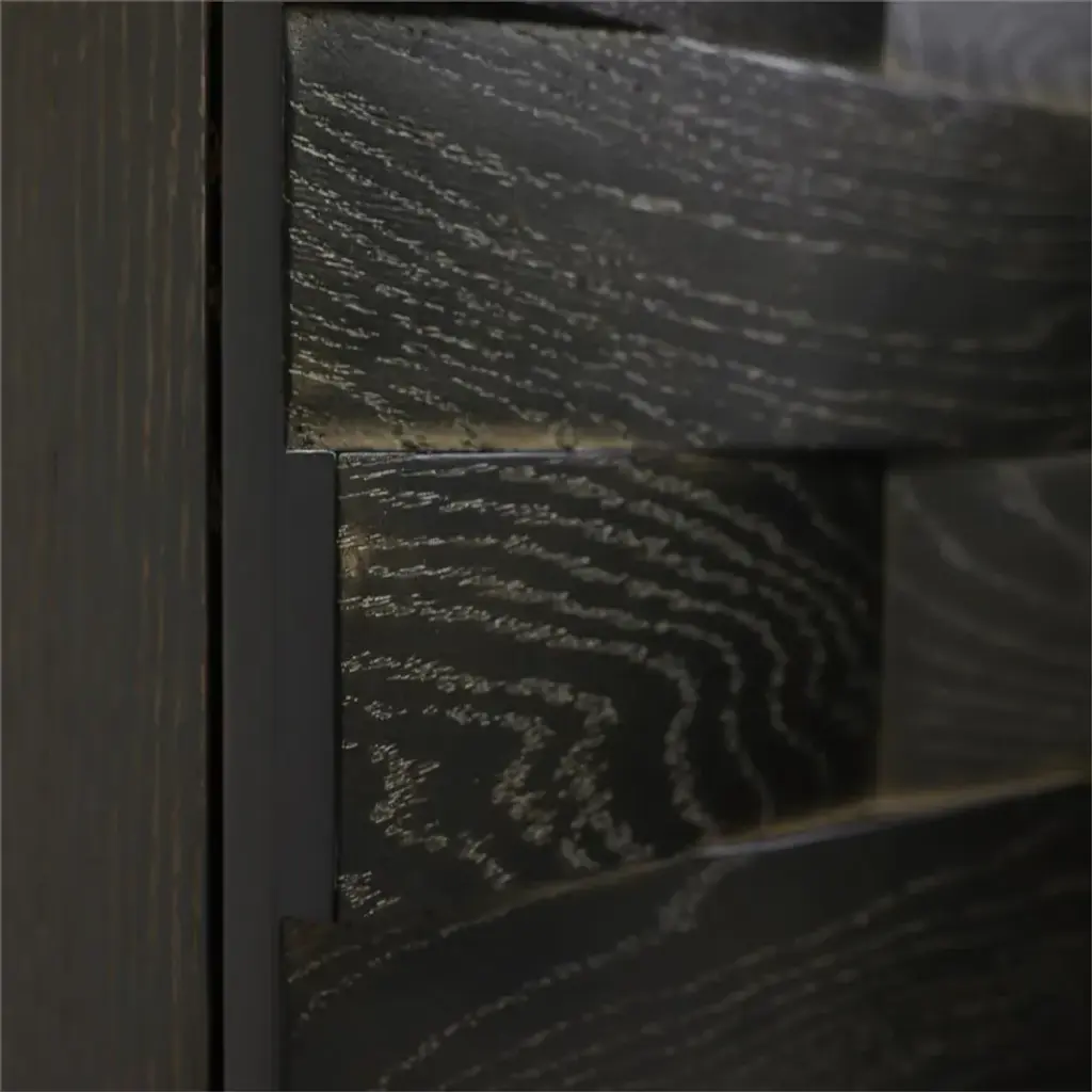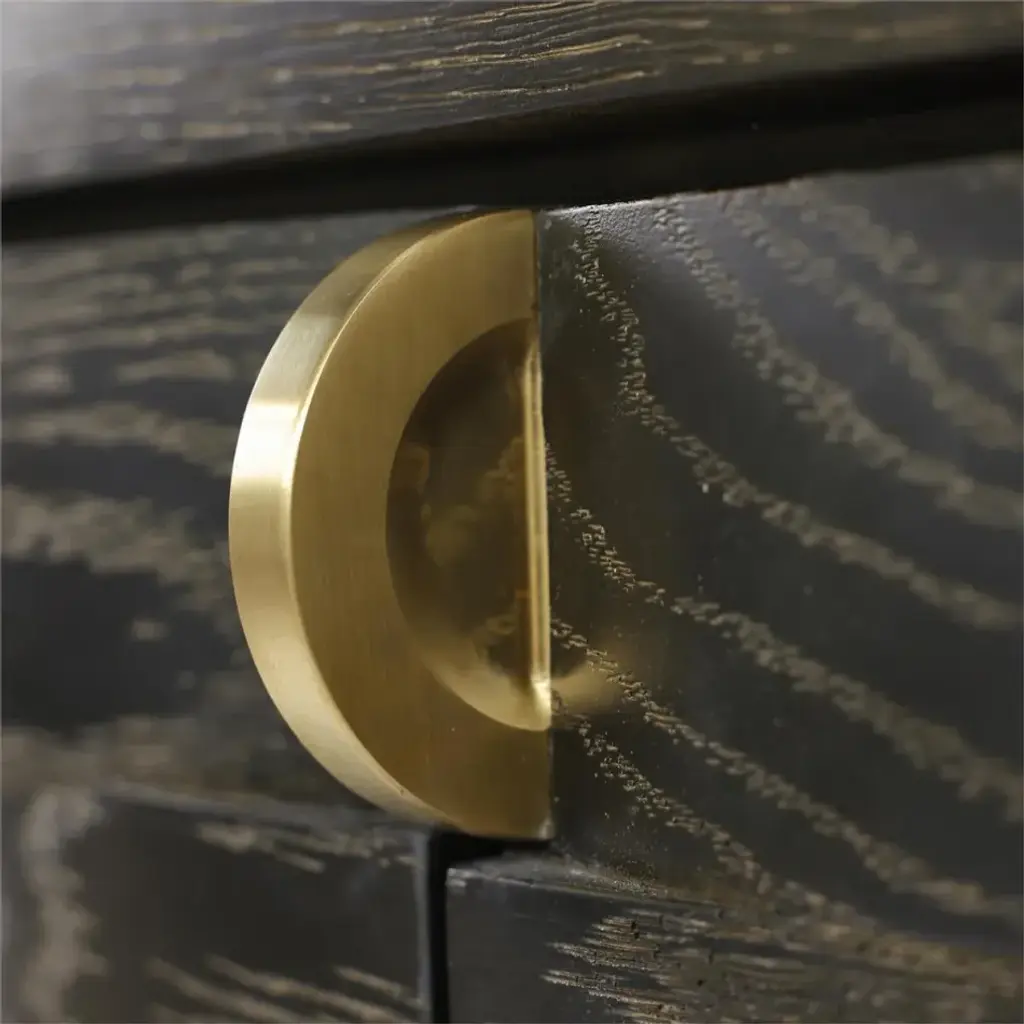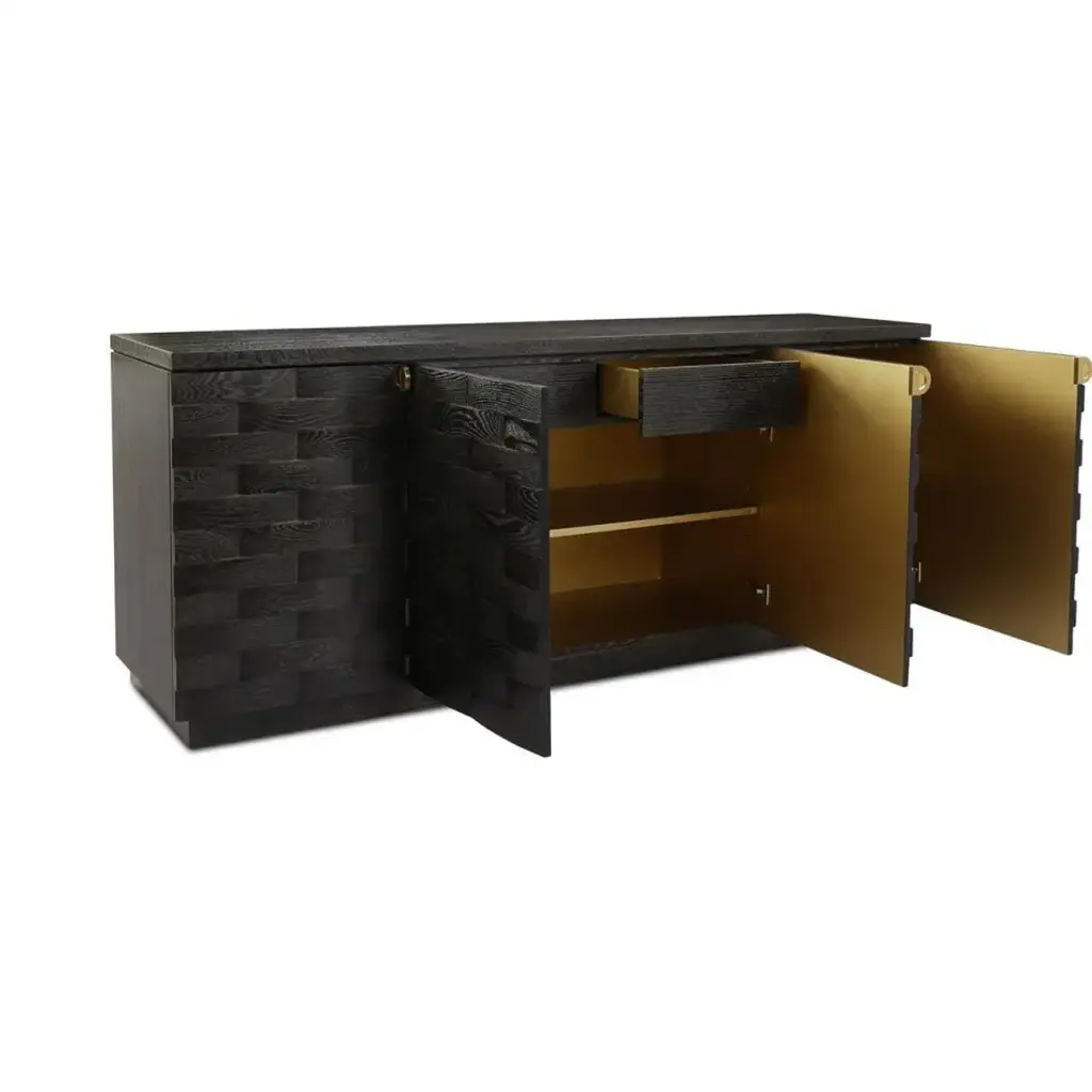 The Tessere Credenza contributes a stunning sense of depth and dimension to an interior space. Crafted from oak wood in a Gold Cerused Black finish, the piece showcases a gorgeous weave pattern across four doors with soft closing hinges. Three interior compartments, each with a single adjustable shelf, display a gold-powder finish that beautifully matches the hardware in brushed brass. This piece also comes equipped with push latch drawer runners for a handle-free experience.