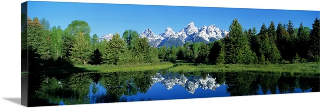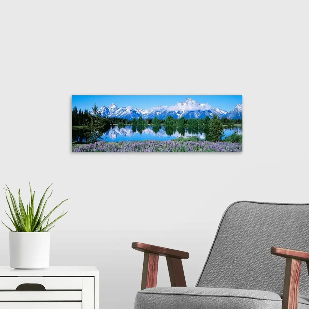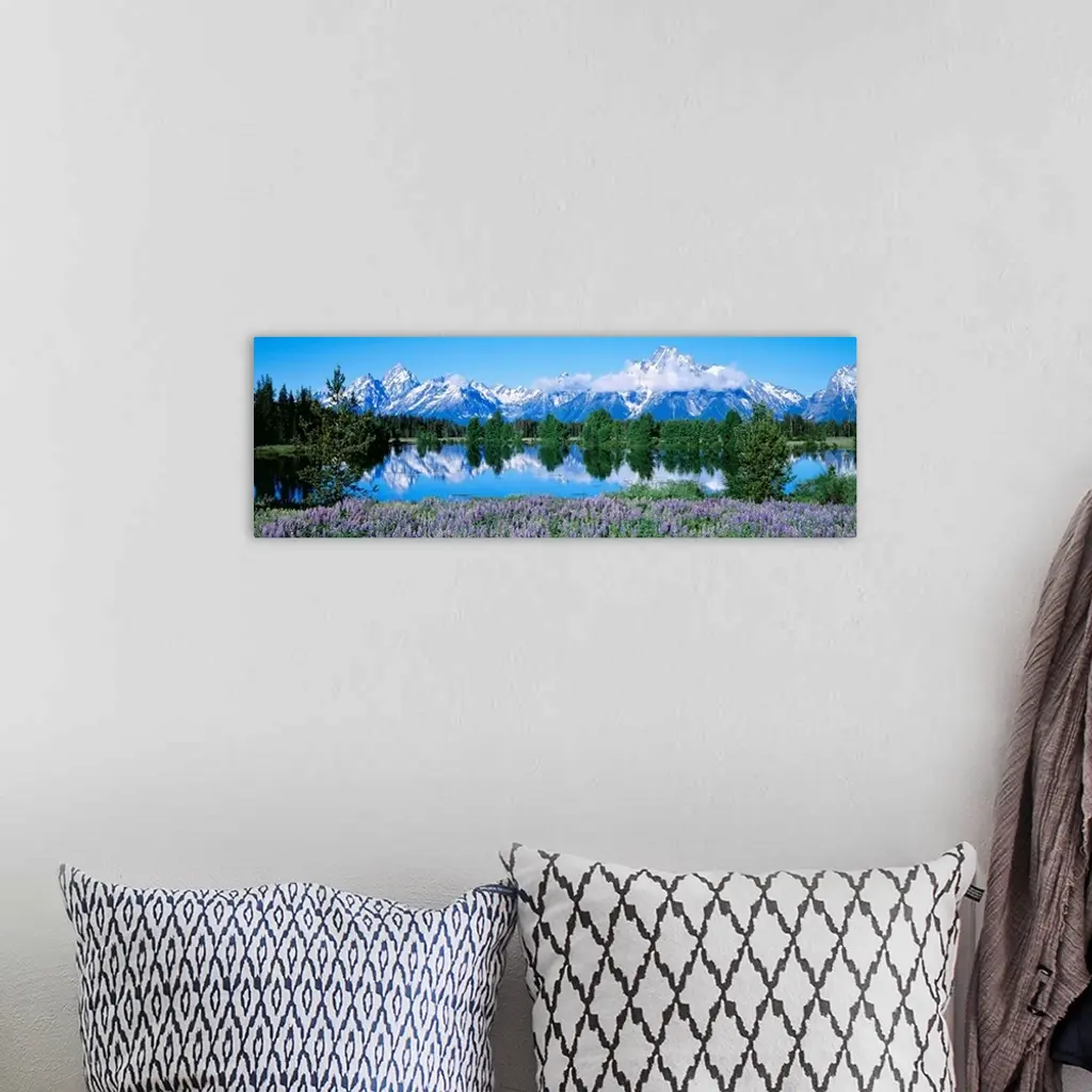 This panoramic landscape photograph shows wildflowers growing around a lake that reflects the trees and snowcapped mountains in the distance.