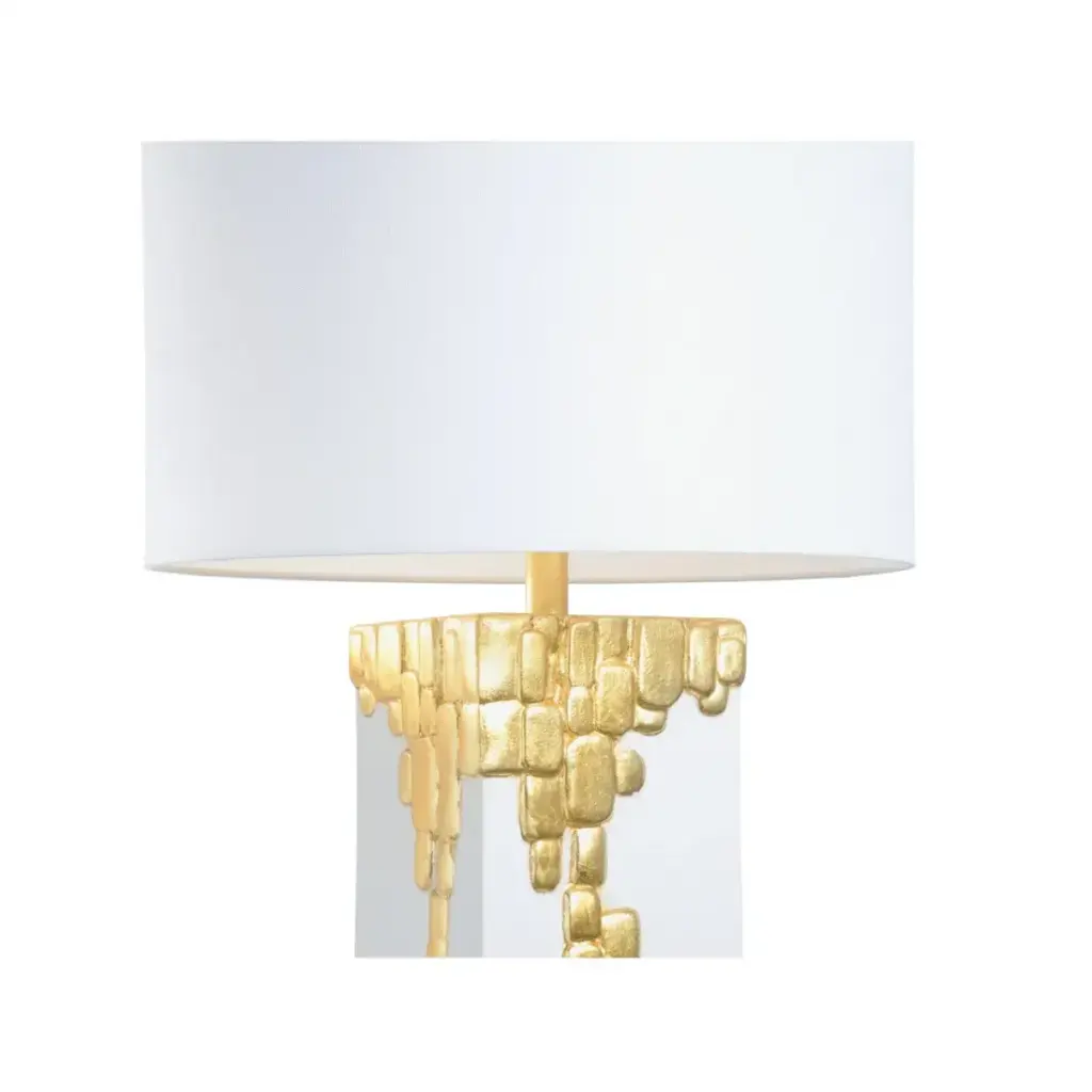 This square shaped lamp is crafted from white painted ceramic with overlapping rounded metal rectangles finished in satin gold, mounted atop an acrylic base. The Tetris Lamp brings a contemporary look with glamorous details. Designed by Shayla Copas.