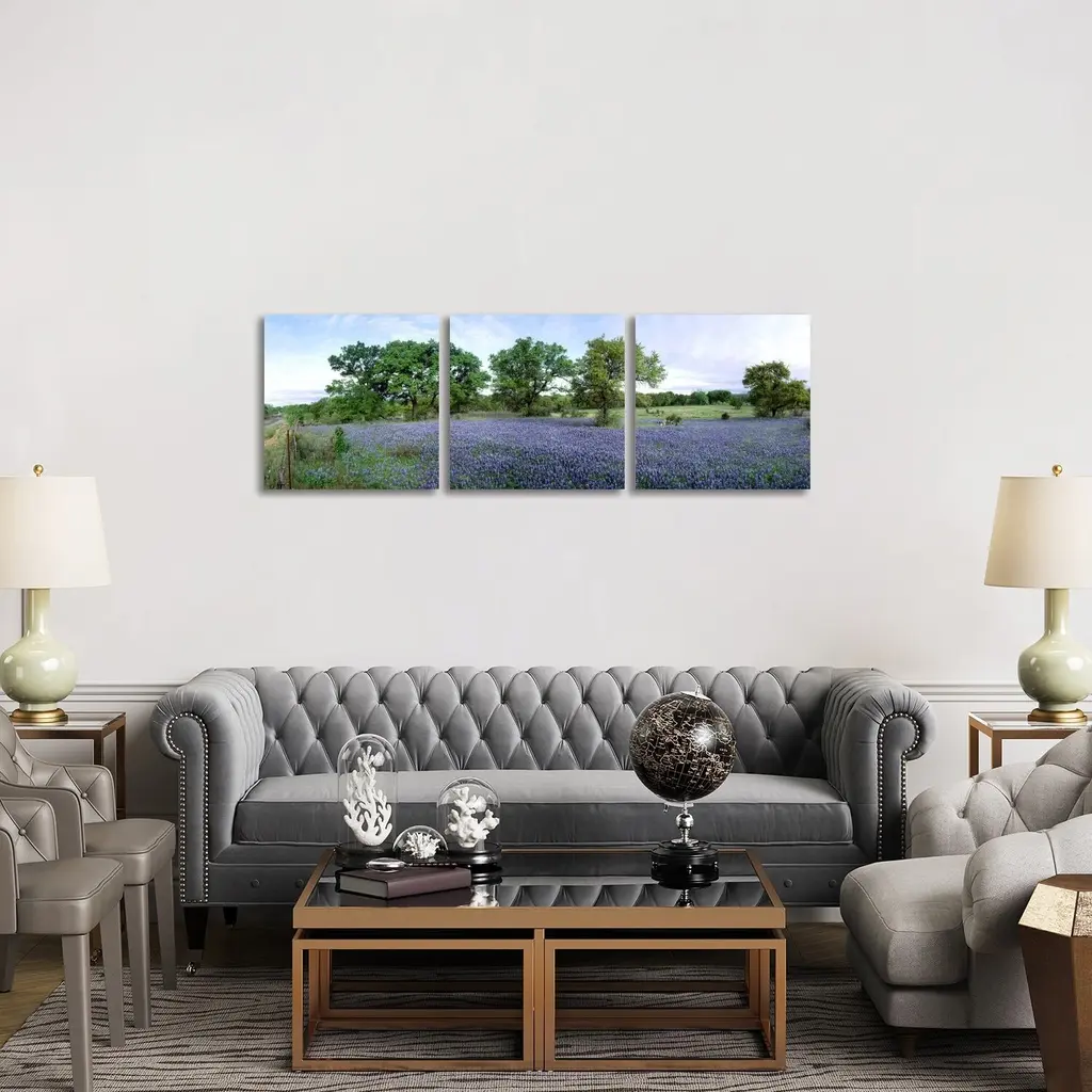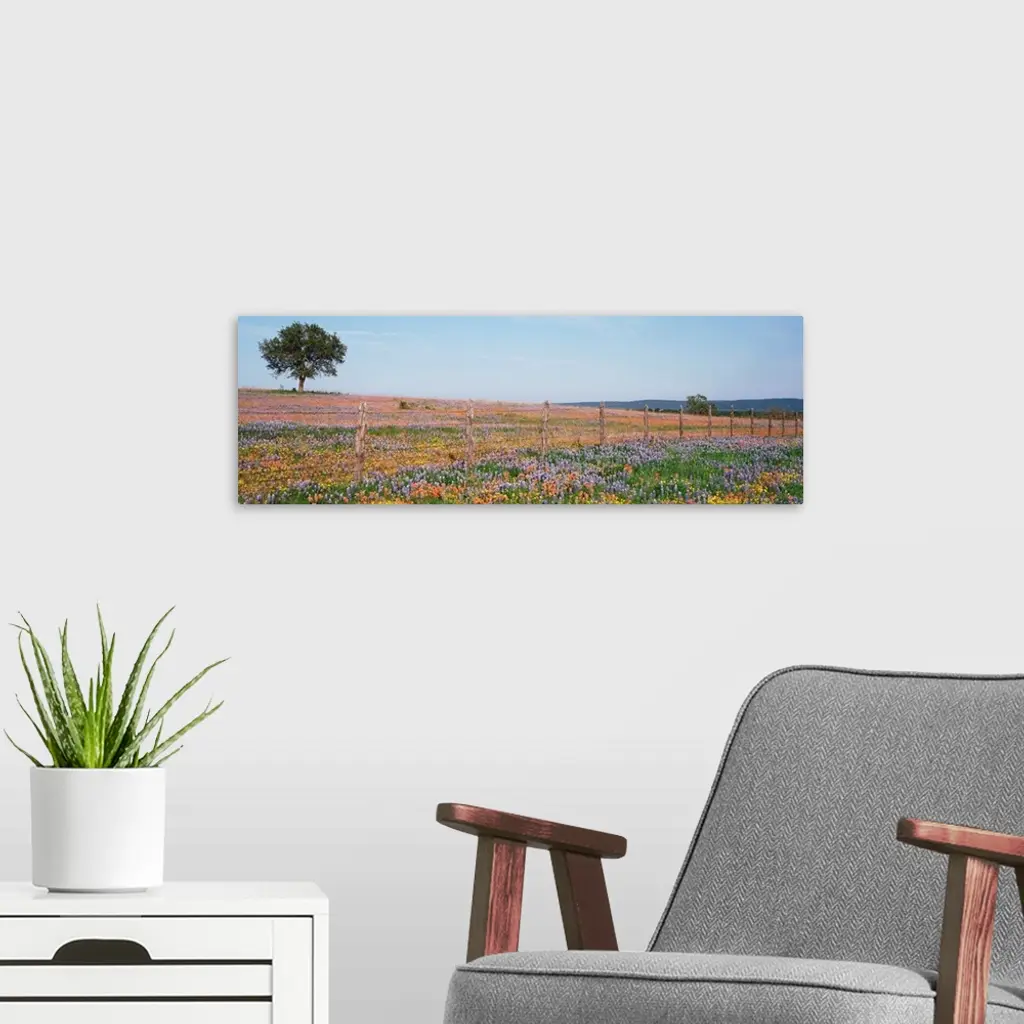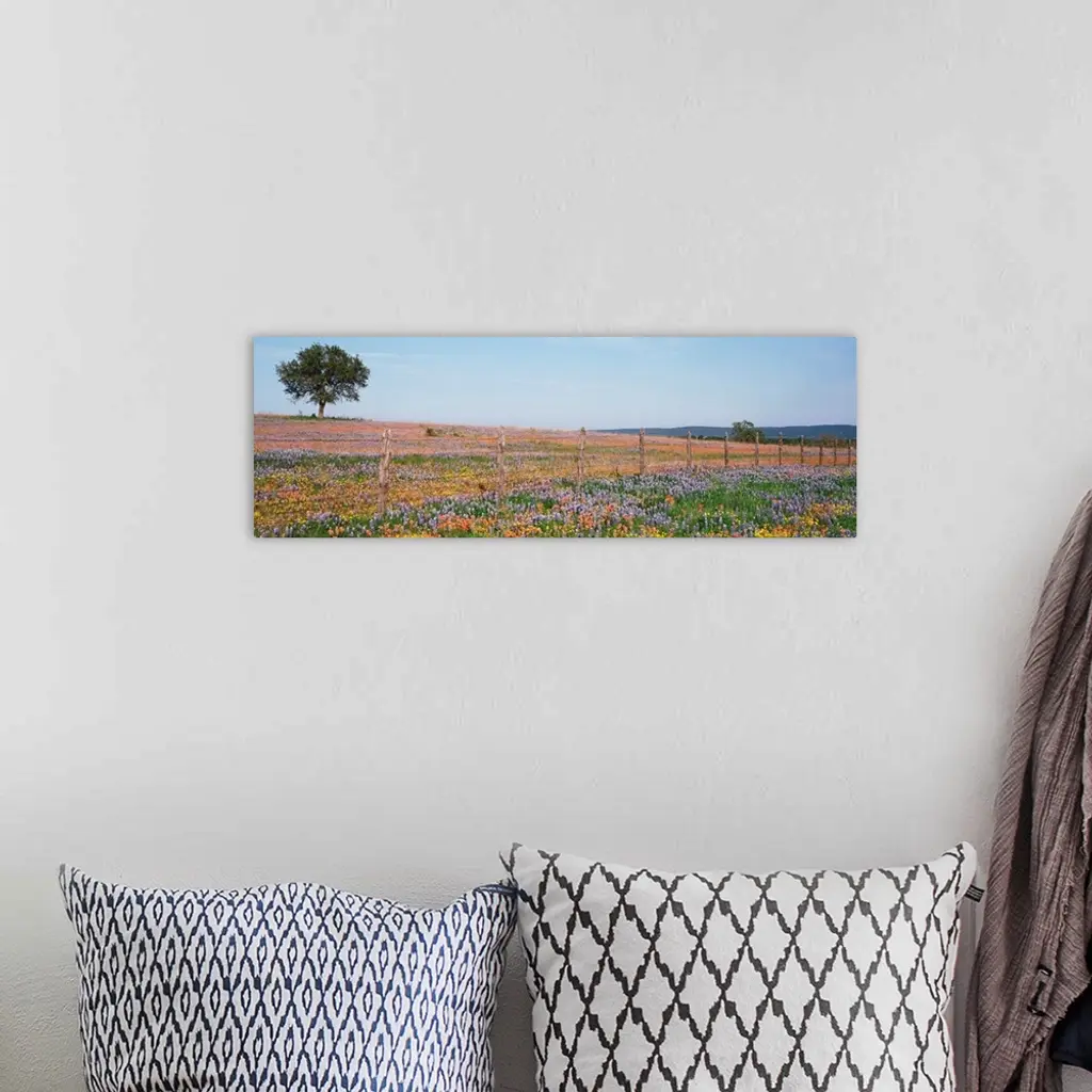 Panoramic photograph displays a large field with endless amounts of colorful flowers that is highlighted by a fence running through it and an isolated giant tree in the background.