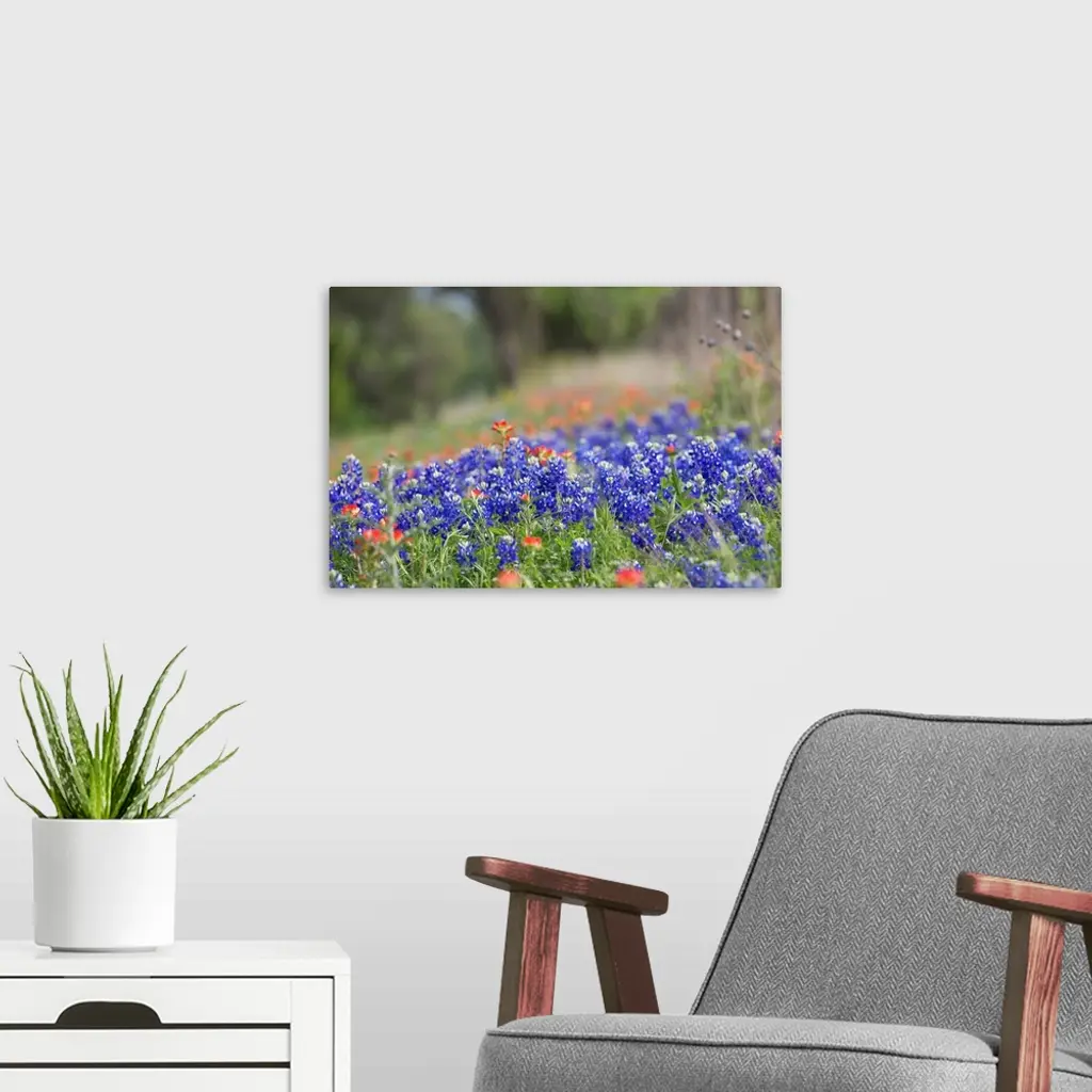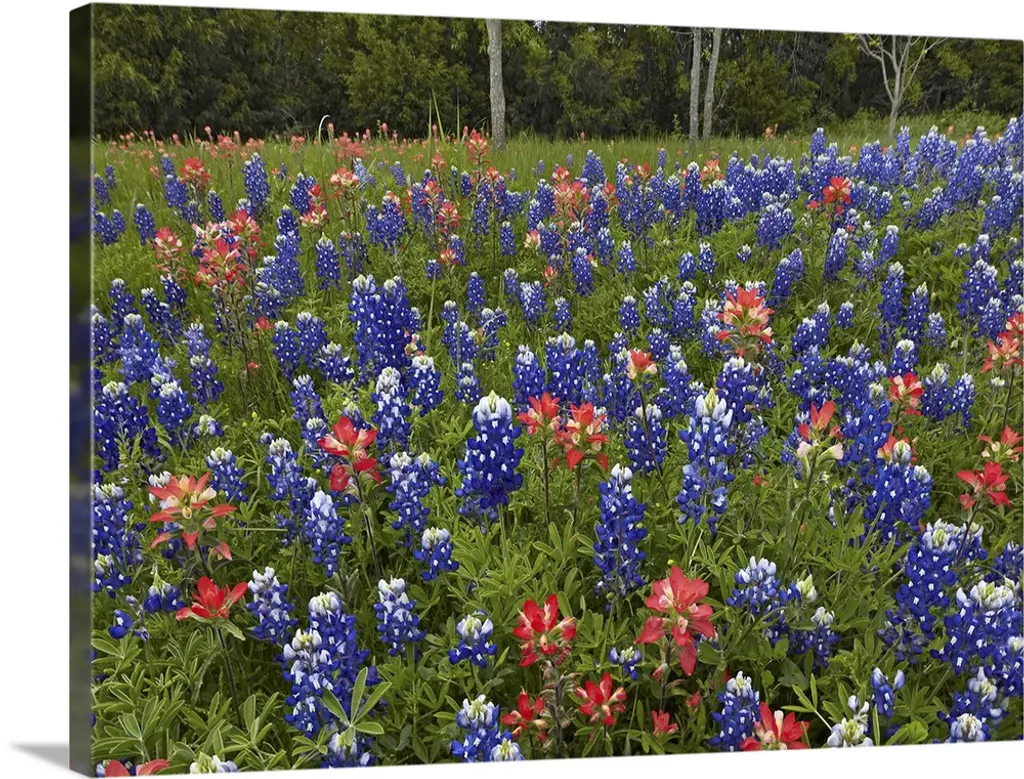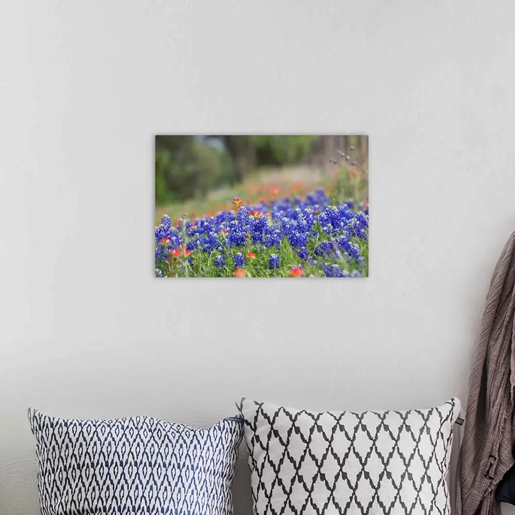 Texas wildflowers in bloom along a dirt road in rural Texas.