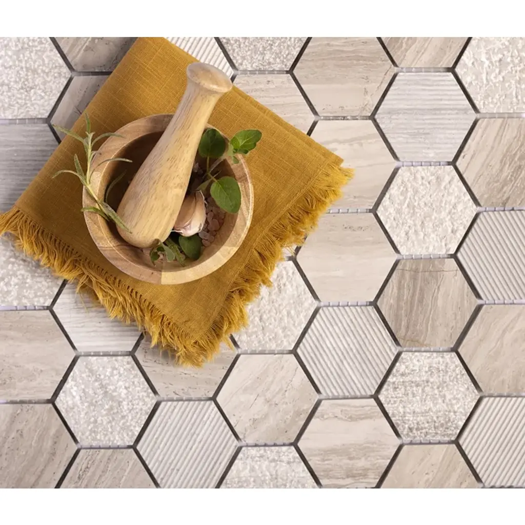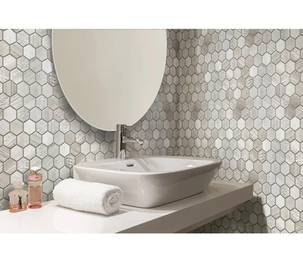 Nothing beats the illusion of natural stone tiles with a stand-out hexagon pattern. Our sophisticated Textured Honeycomb tiles are six-sided artisan mosaics, made of natural stones in different textures and various shades to elevate your design. Whatever your style is, marble tiles offer an easy way to refresh the space by bringing the natural beauty and classic appeal on any surface applied. You can create a neutral backdrop by using this mosaic tile and combine it with almost any accent color. Whether you choose to create dazzling geometric floors, timeless backsplashes or accent walls, mosaic tiles in hexagon shape will create a refined statement and make your space uniquely yours.
