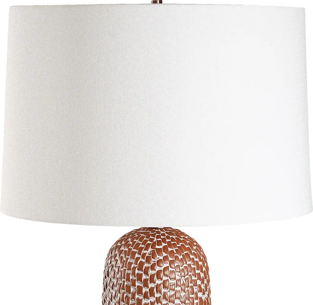 The Thaddeus Lake Brown Lamp adds a touch of texture and elegance to any space. Its base is crafted from porcelain, featuring an organic basket weave pattern finished in a warm brown with a heavy off-white glaze, paired with brass plated details. The slightly tapered round hardback shade is made in a crisp white linen fabric. Partial assembly may be required.