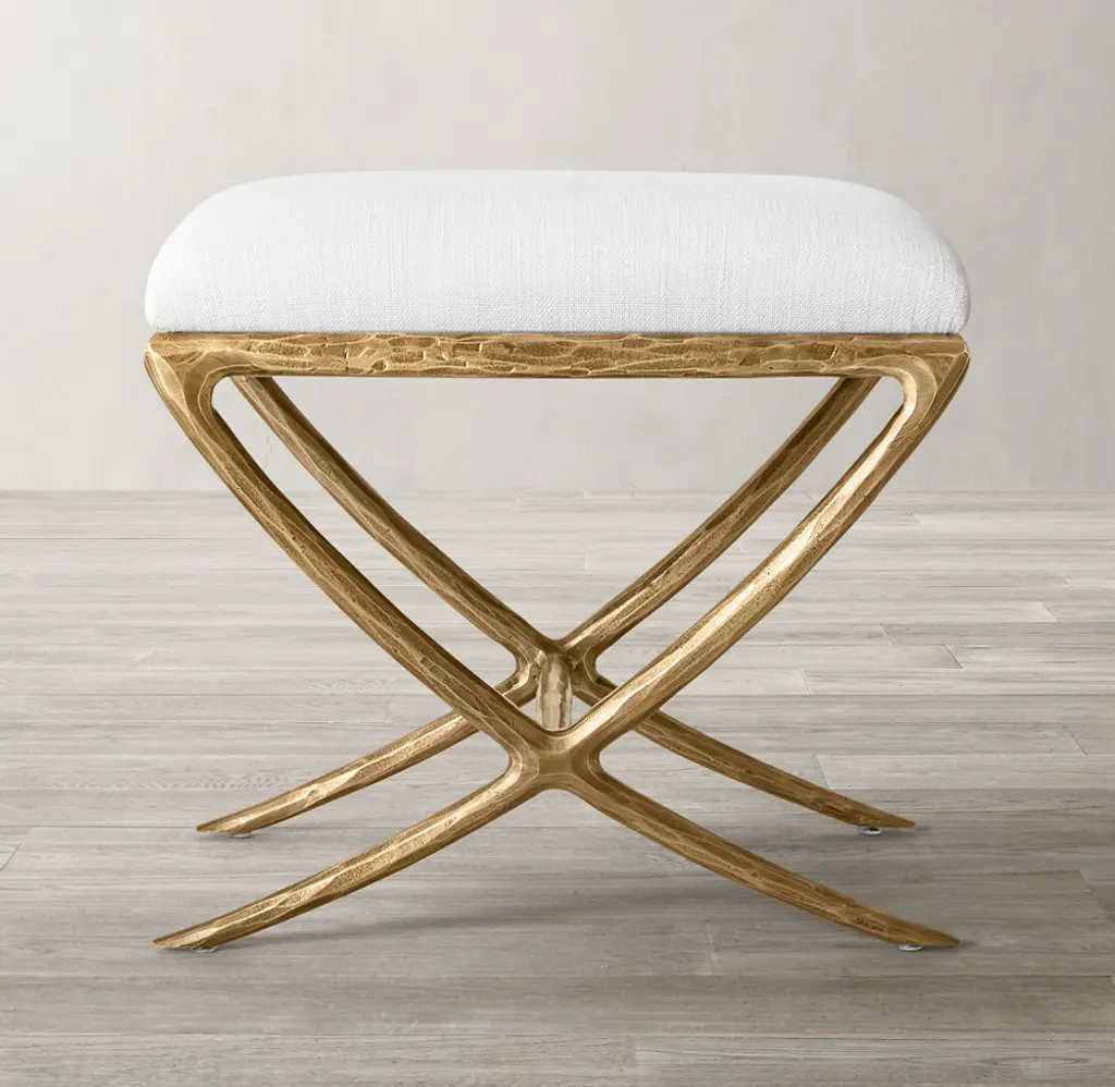 Inspired by the sculptural works of Salvador Dalí and Diego Giacometti, our stool from Julie Lawrence merges the rustic sensibility of a hand-forged metal base with tailored upholstery. Employing an ancient fabrication process, artisans hand hammer the metal bars to reveal an alive, imperfect and organic texture, a counterpoint to the frame's slender, tapered silhouette. ALSO AVAILABLE IN LEATHER SHOP THE ENTIRE COLLECTION