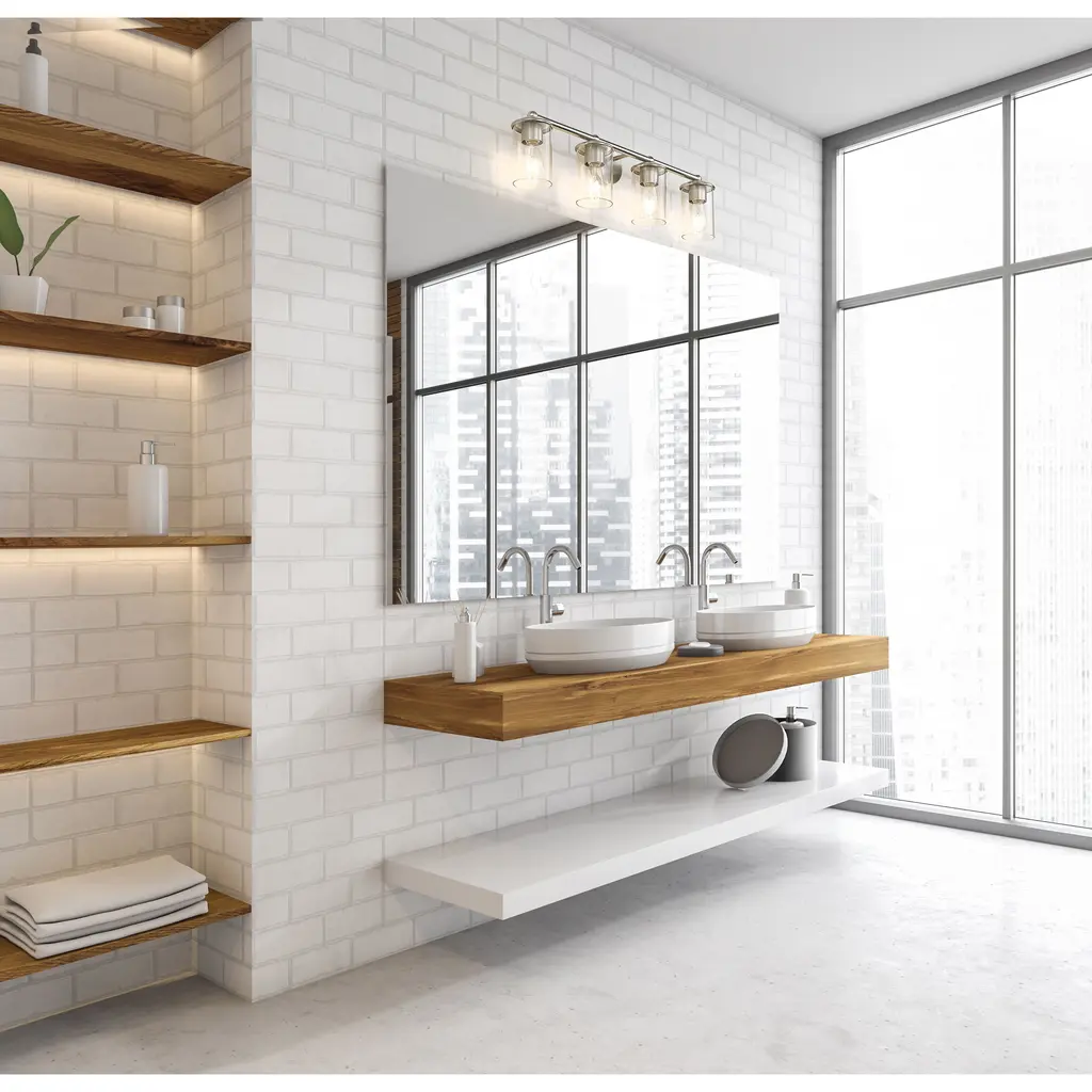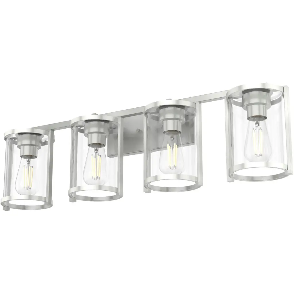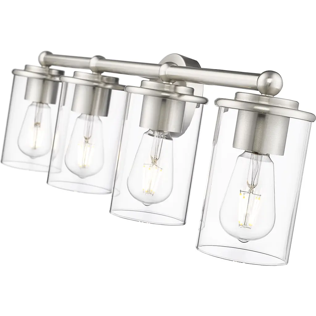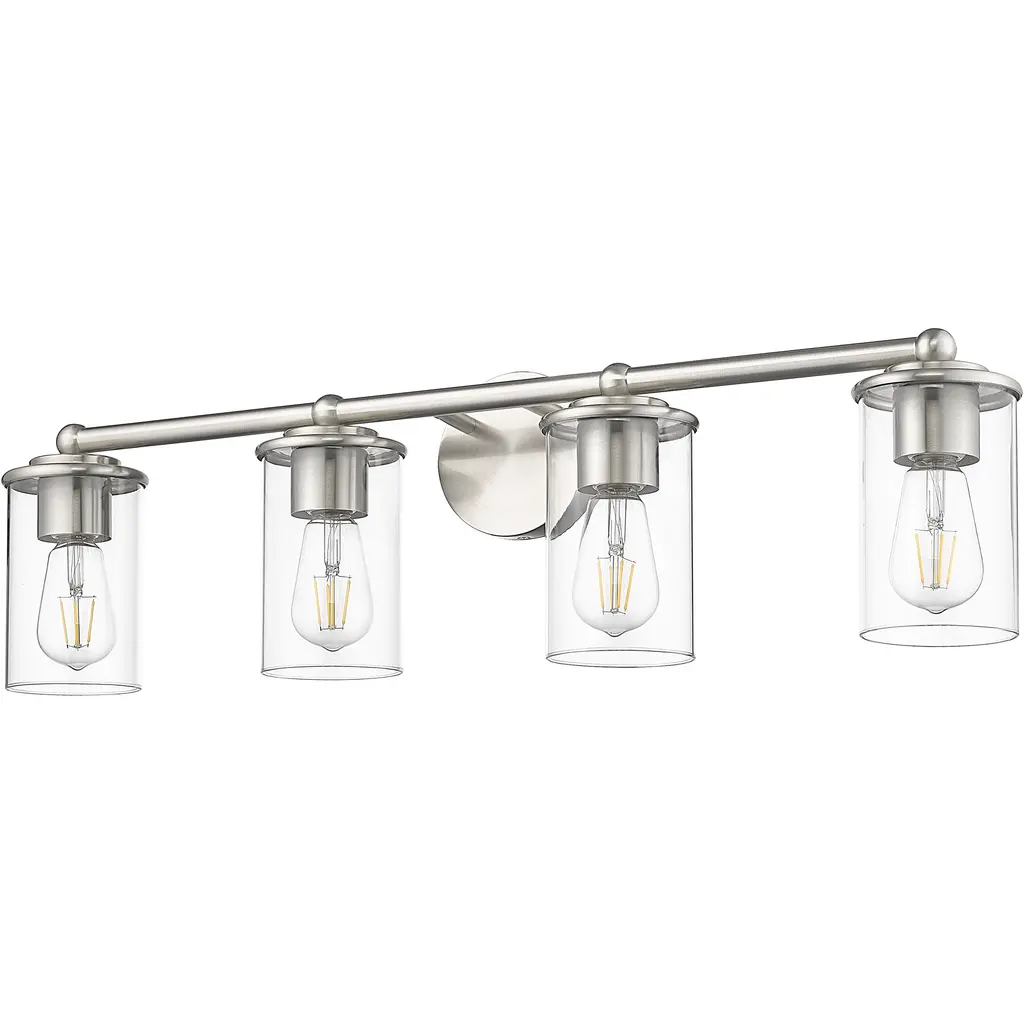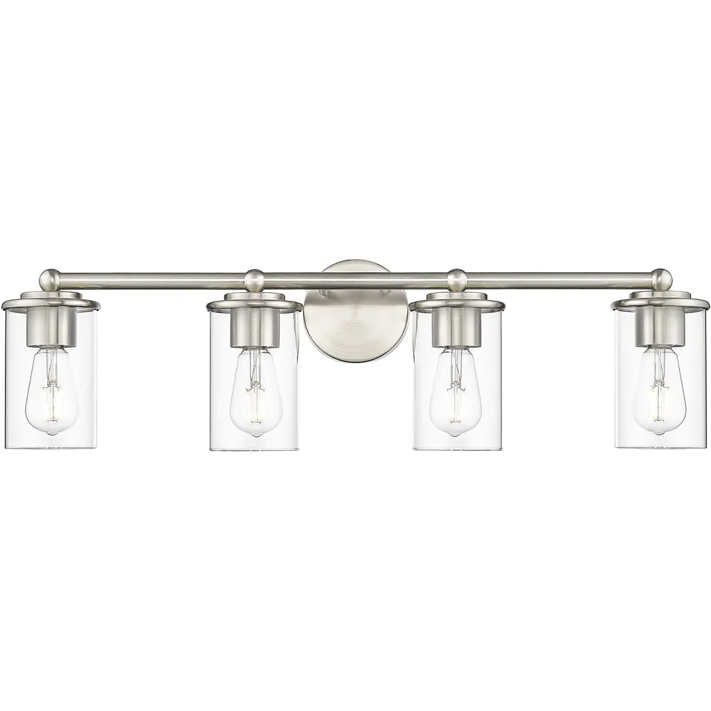 Appreciate the versatility of modern simplicity in a chic, modern four-light vanity fixture. From the Thayer collection, it's a charming, understated design that pairs graceful curvature with a refined brushed nickel finish and cylinders of crystal clear glass for bright, direct illumination ideal for a master or guest bath.