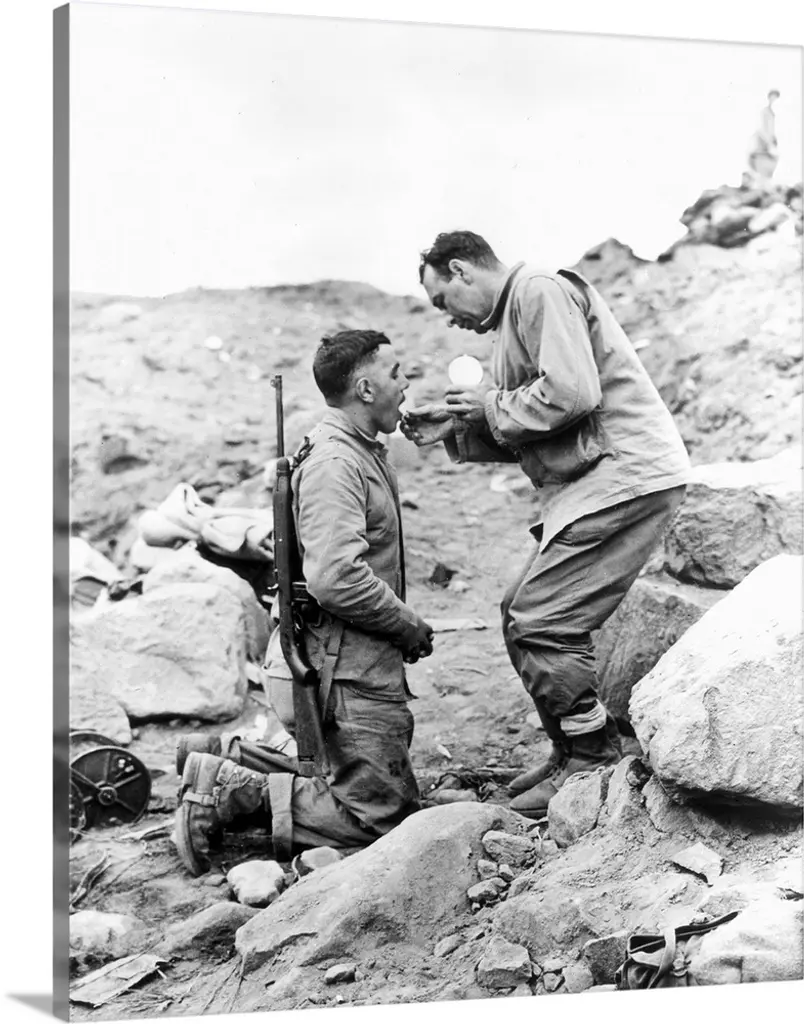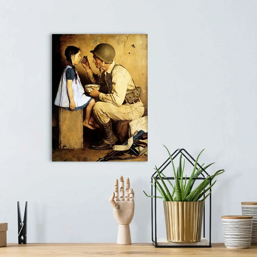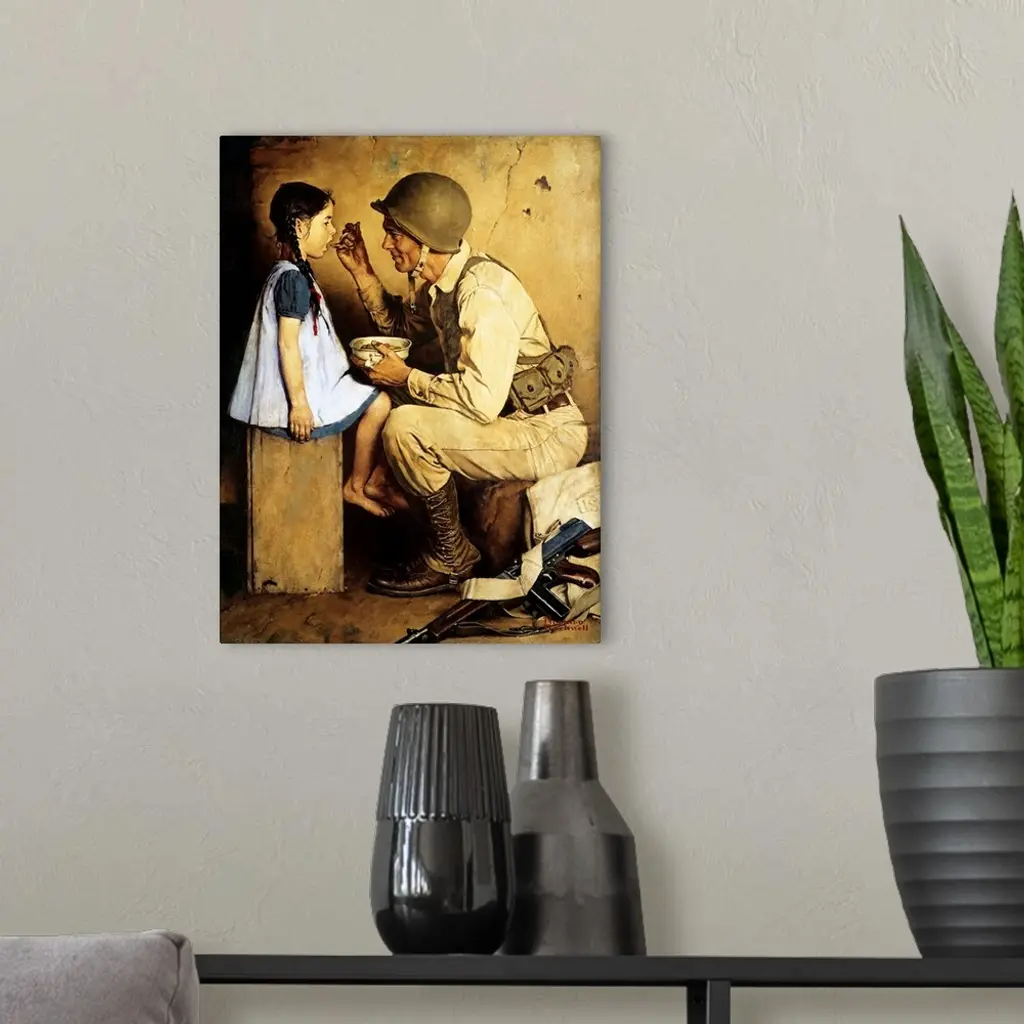 Distant from the activities of the war raging in Europe, Norman Rockwell was challenged to record his interpretation of the effects of World War II on servicemen, and on Americans at home. Alternate Title: Soldier Feeding Girl. Approved by the Norman Rockwell Family Agency