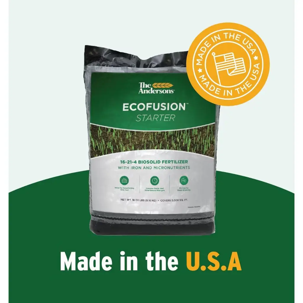 The Andersons EcoFusion Starter 16-21-4 is a professional-grade biosolid fertilizer. This formula contains micronutrients copper, manganese, and zinc as well as 5% iron for extra-deep greening. EcoFusion Starter supplies immediate and sustained feeding with both quick- and slow-release nitrogen. EcoFusion Starter contains phosphorus and is designed for use when establishing new turf or renovating current turf. It can be used as a maintenance fertilizer when the need is indicated from soil test results. For best results, reapply every 4-6 weeks.