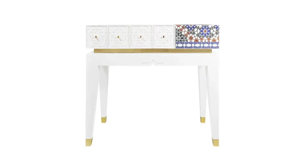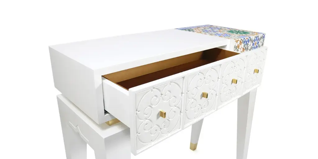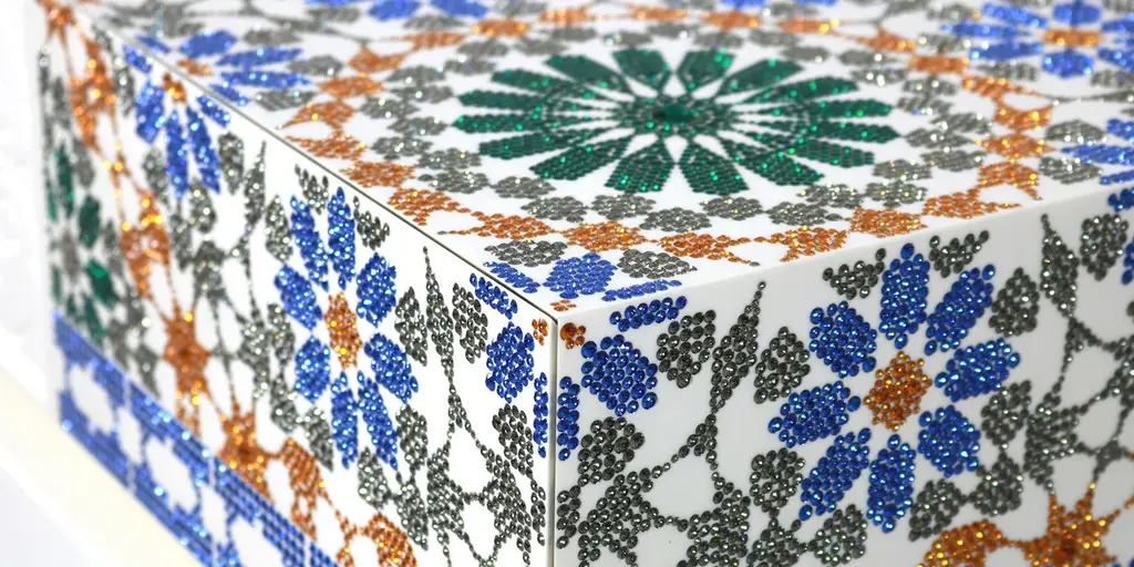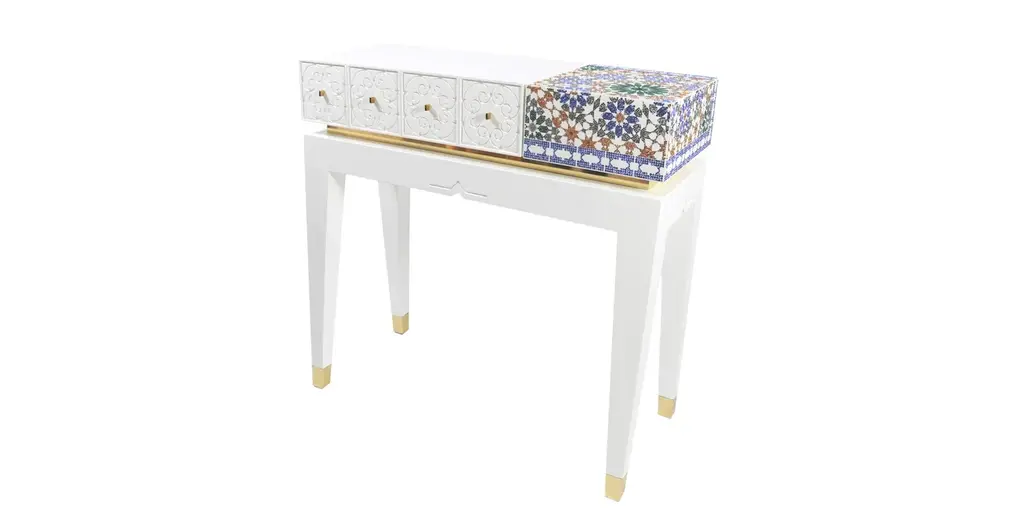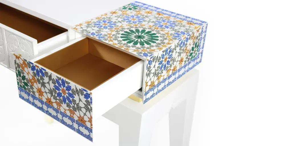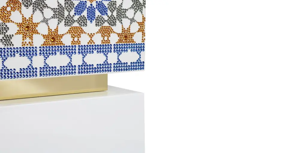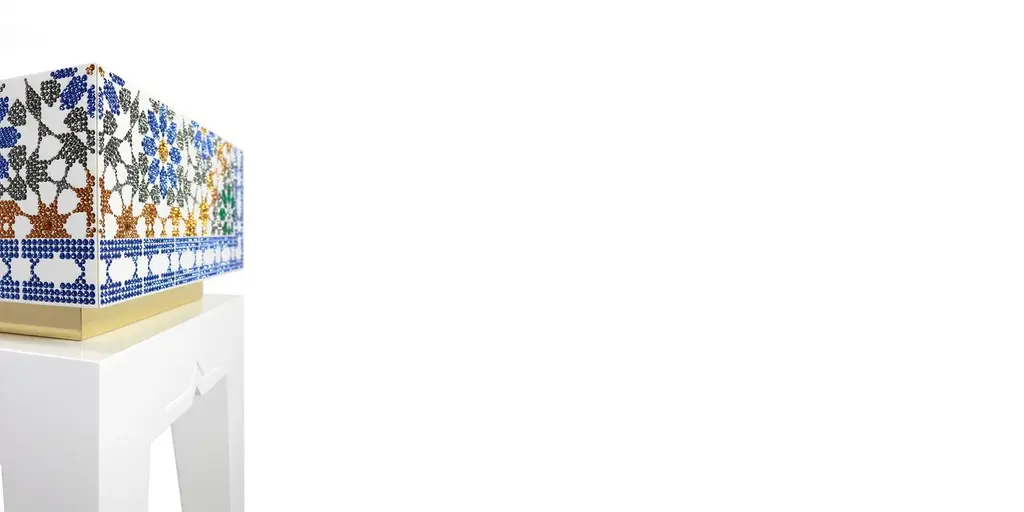 El Ba'ia console reflets the colours of architecture of the Marocan Palaces. The zellige art and its pattern is well represented in the counter through the swarovski crystals. Designers used, historically, zellige to decorate wonderful homes as a statement of luxury and social status. Labeled by Maker