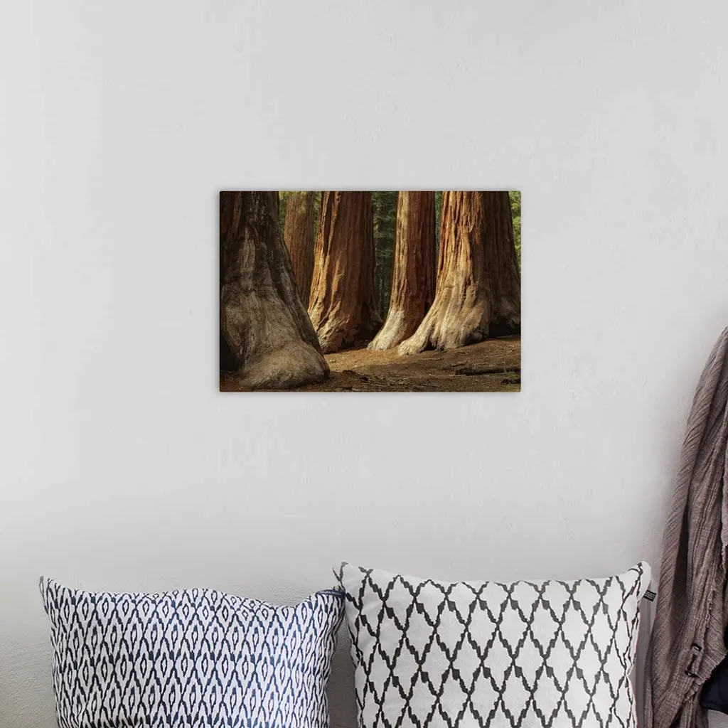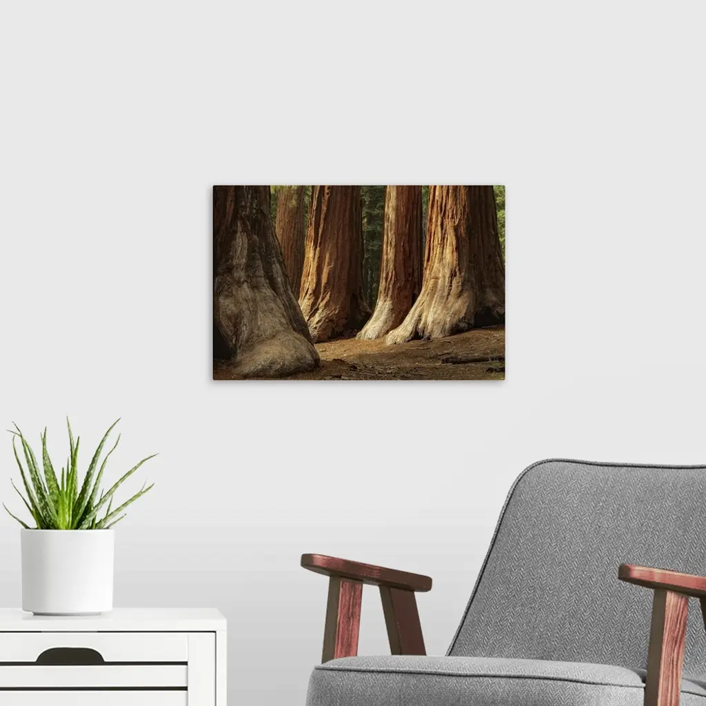 Soft light daytime view of the Bachelor and Three Graces, four giant sequoias in Mariposa Grove.
