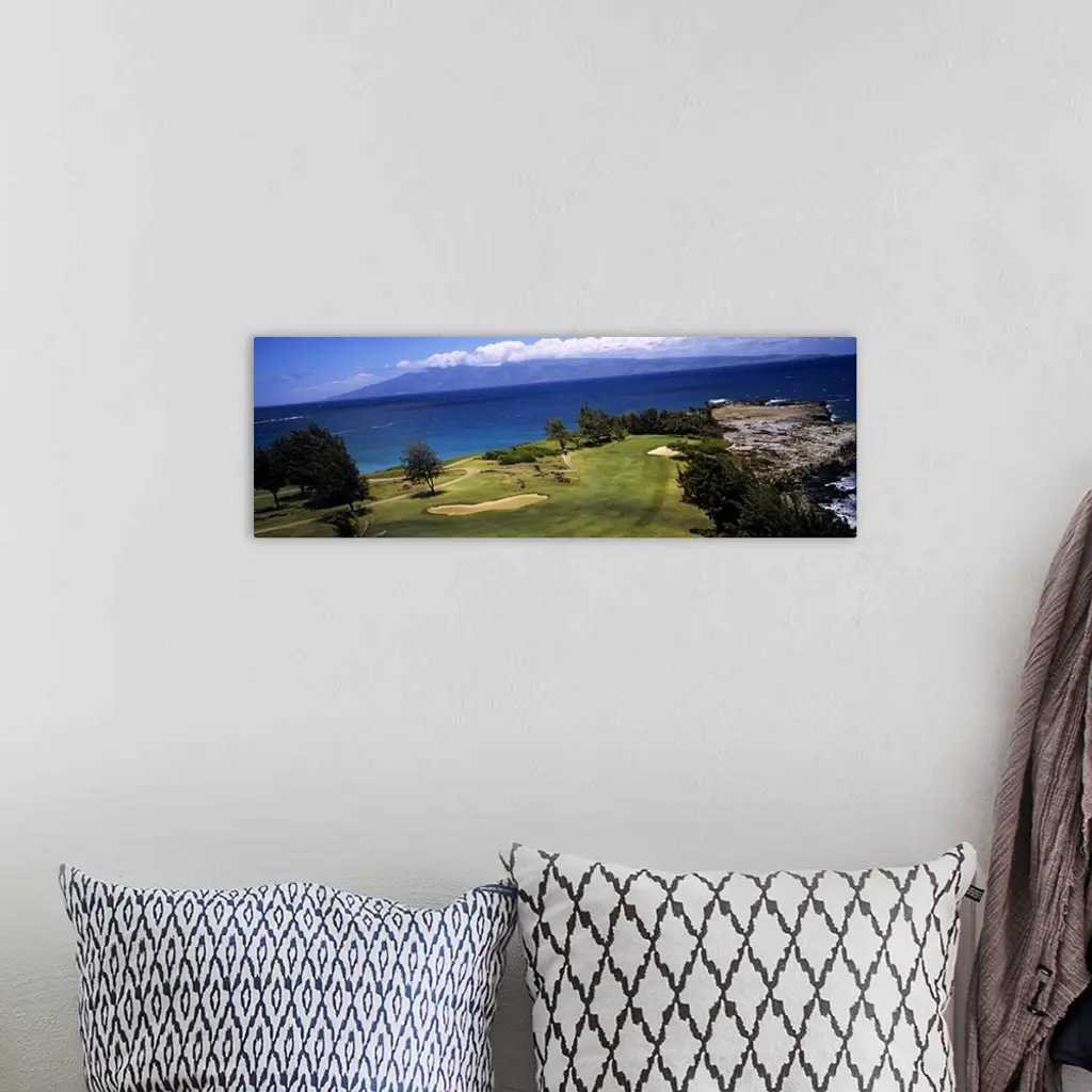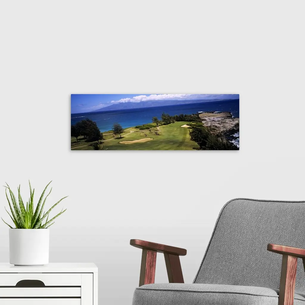 This panoramic photograph is a golf landscape overlooking the ocean from a tropical island.
