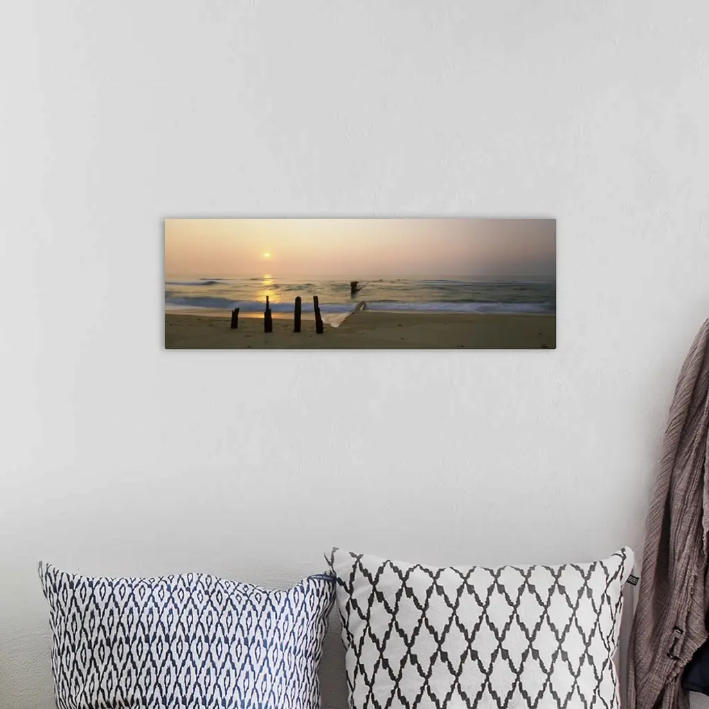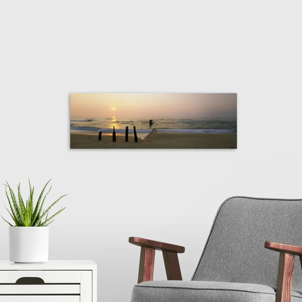 Posts and tide break on the beach at sunrise, Cape Hatteras National Seashore, North Carolina, USA