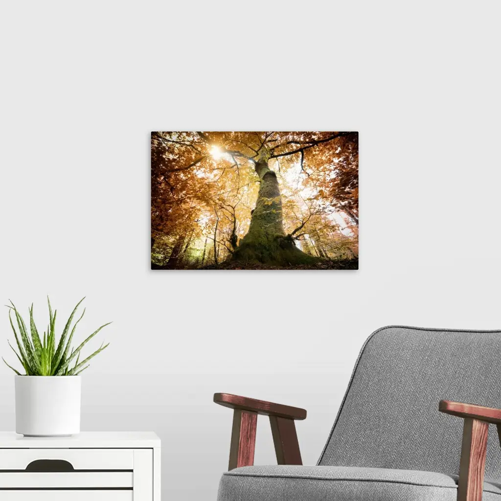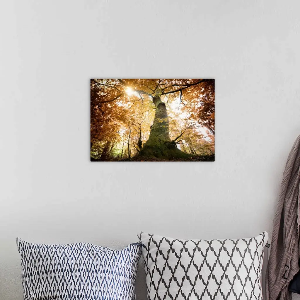 A big red oak in the forest, a wide angle shot. Green truck and red leaves with sun rays passing throw the leaves at the top of the tree.